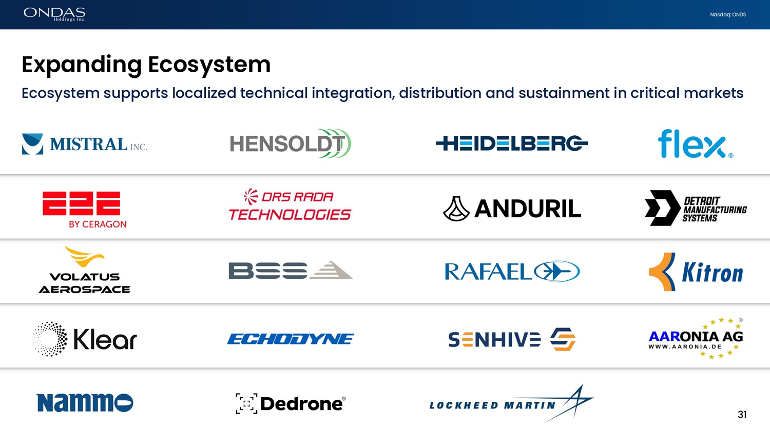 Nasdaq: ONDS Exp6fidifig Ecosystem 31 Ecosystem supports localized technical integration, distribution and sustainment in critical markets