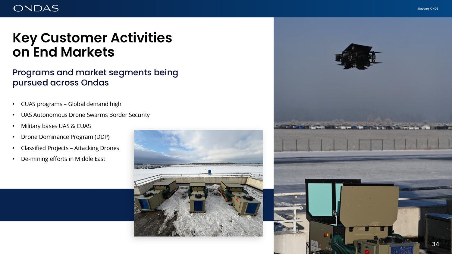 Nasdaq: ONDS Key Customer Activities ofi Efid M6rkets Programs and market segments being pursued across Ondas • CUAS programs – Global demand high • UAS Autonomous Drone Swarms Border Security • Military bases UAS & CUAS • Drone Dominance Program (DDP) • Classified Projects – Attacking Drones • De - mining efforts in Middle East 34 34
