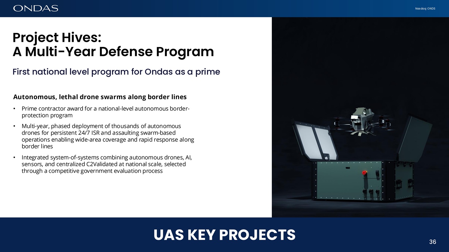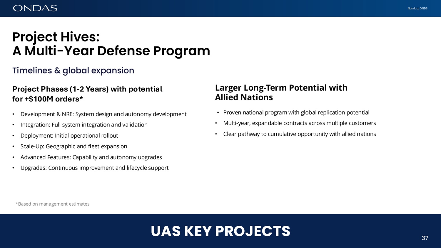 Nasdaq: ONDS Project Hives: A Multi - Ye6r Defefise Progr6m 36 UAS KEY PROJECTS 36 First national level program for Ondas as a prime Autonomous, lethal drone swarms along border lines • Prime contractor award for a national - level autonomous border - protection program • Multi - year, phased deployment of thousands of autonomous drones for persistent 24/7 ISR and assaulting swarm - based operations enabling wide - area coverage and rapid response along border lines • Integrated system - of - systems combining autonomous drones, AI, sensors, and centralized C2Validated at national scale, selected through a competitive government evaluation process