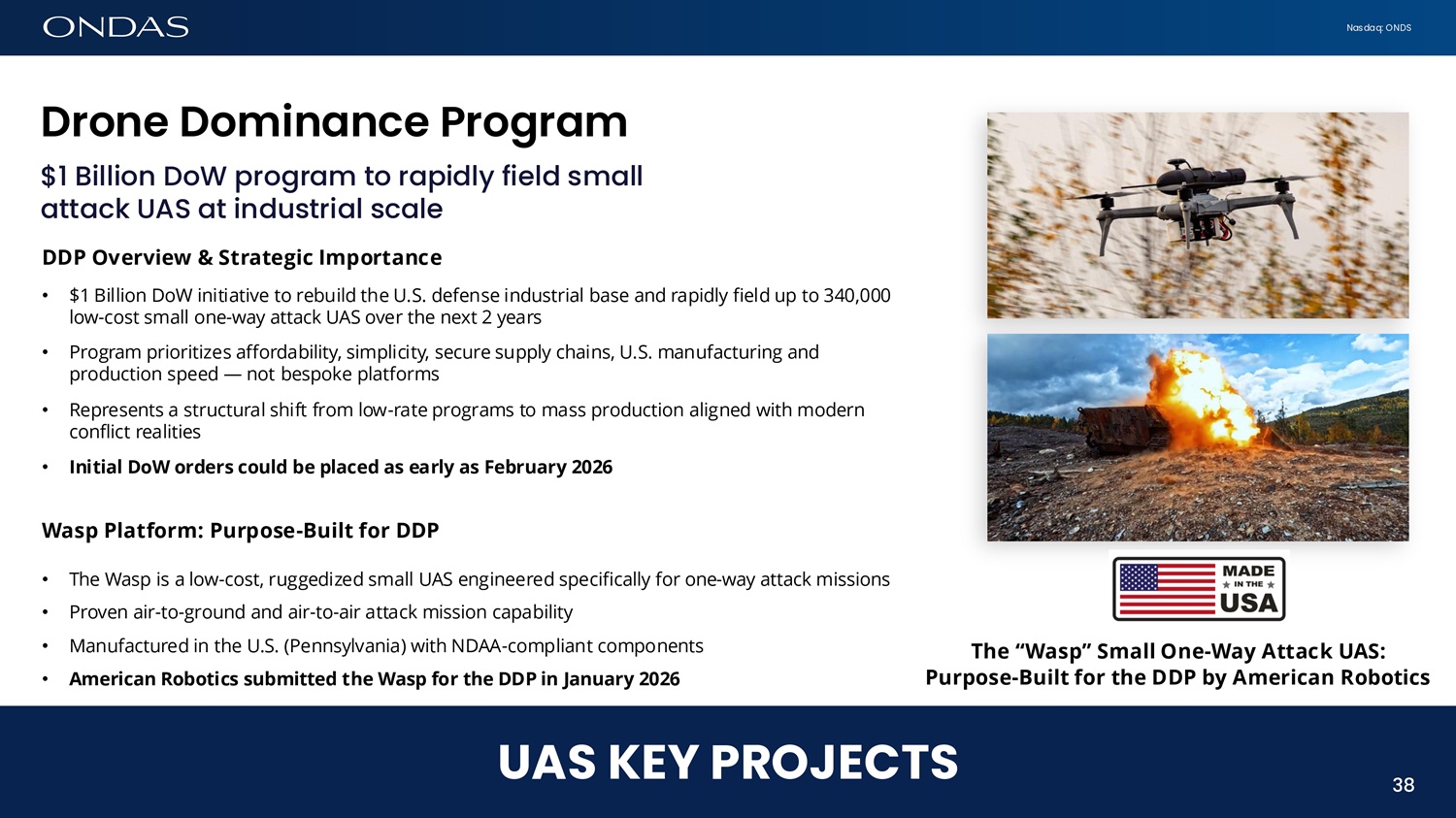 Nasdaq: ONDS $1 Billion DoW program to rapidly field small attack UAS at industrial scale DDP Overview & Strategic Importance • $1 Billion DoW initiative to rebuild the U.S. defense industrial base and rapidly field up to 340,000 low - cost small one - way attack UAS over the next 2 years • Program prioritizes affordability, simplicity, secure supply chains, U.S. manufacturing and production speed — not bespoke platforms • Represents a structural shift from low - rate programs to mass production aligned with modern conflict realities • Initial DoW orders could be placed as early as February 2026 Drofie Domifi6fice Progr6m Wasp Platform: Purpose - Built for DDP • The Wasp is a low - cost, ruggedized small UAS engineered specifically for one - way attack missions • Proven air - to - ground and air - to - air attack mission capability • Manufactured in the U.S. (Pennsylvania) with NDAA - compliant components • American Robotics submitted the Wasp for the DDP in January 2026 The “Wasp” Small One - Way Attack UAS: Purpose - Built for the DDP by American Robotics 36 UAS KEY PROJECTS 38
