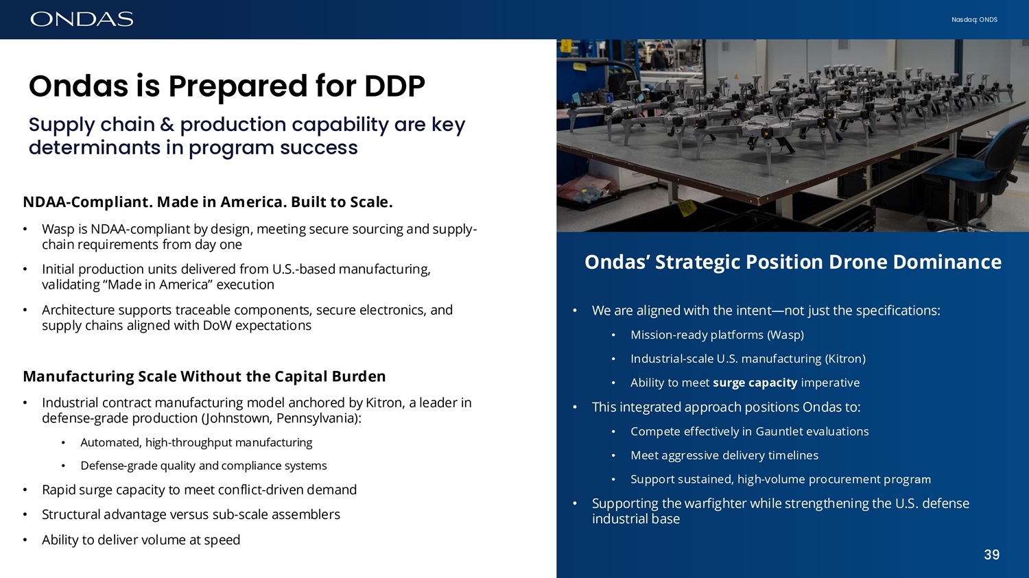 Nasdaq: ONDS Ofid6s is Prep6red for DDP Supply chain & production capability are key determinants in program success NDAA - Compliant. Made in America. Built to Scale. • Wasp is NDAA - compliant by design, meeting secure sourcing and supply - chain requirements from day one • Initial production units delivered from U.S. - based manufacturing, validating “Made in America” execution • Architecture supports traceable components, secure electronics, and supply chains aligned with DoW expectations Manufacturing Scale Without the Capital Burden • Industrial contract manufacturing model anchored by Kitron, a leader in defense - grade production (Johnstown, Pennsylvania): • Automated, high - throughput manufacturing • Defense - grade quality and compliance systems • Rapid surge capacity to meet conflict - driven demand • Structural advantage versus sub - scale assemblers • Ability to deliver volume at speed Ondas’ Strategic Position Drone Dominance • We are aligned with the intent — not just the specifications: • Mission - ready platforms (Wasp) • Industrial - scale U.S. manufacturing (Kitron) • Ability to meet surge capacity imperative • This integrated approach positions Ondas to: • Compete effectively in Gauntlet evaluations • Meet aggressive delivery timelines • Support sustained, high - volume procurement program • Supporting the warfighter while strengthening the U.S. defense industrial base 39