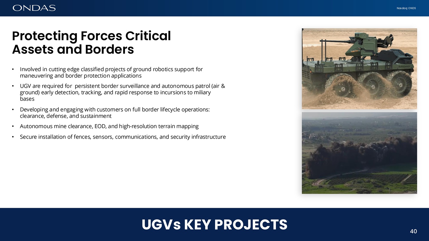 Nasdaq: ONDS Protectifig Forces Critic6l Assets 6fid Borders • Involved in cutting edge classified projects of ground robotics support for maneuvering and border protection applications • UGV are required for persistent border surveillance and autonomous patrol (air & ground) early detection, tracking, and rapid response to incursions to miliary bases • Developing and engaging with customers on full border lifecycle operations: clearance, defense, and sustainment • Autonomous mine clearance, EOD, and high - resolution terrain mapping • Secure installation of fences, sensors, communications, and security infrastructure 40 UGVs KEY PROJECTS 40