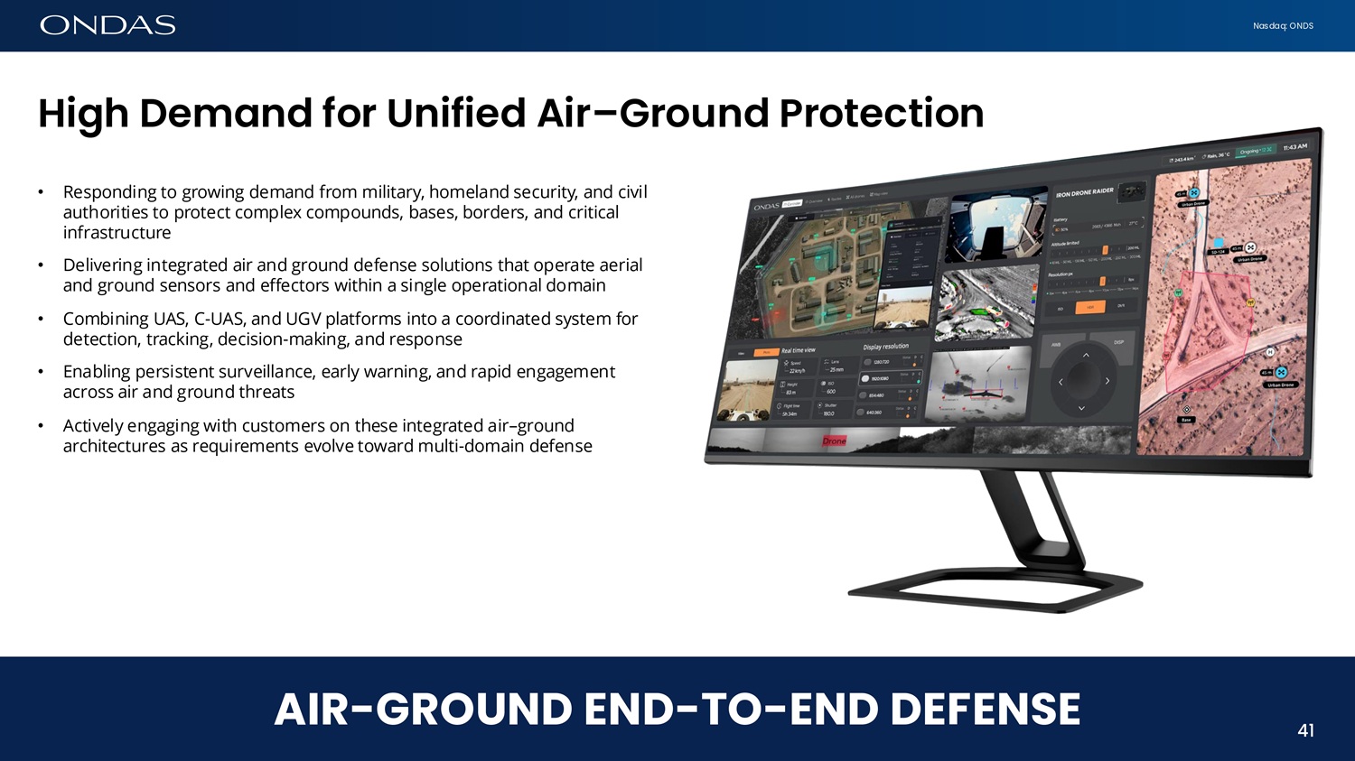 Nasdaq: ONDS High Dem6fid for Ufiified Air – Groufid Protectiofi • Responding to growing demand from military, homeland security, and civil authorities to protect complex compounds, bases, borders, and critical infrastructure • Delivering integrated air and ground defense solutions that operate aerial and ground sensors and effectors within a single operational domain • Combining UAS, C - UAS, and UGV platforms into a coordinated system for detection, tracking, decision - making, and response • Enabling persistent surveillance, early warning, and rapid engagement across air and ground threats • Actively engaging with customers on these integrated air – ground architectures as requirements evolve toward multi - domain defense 41 AIR - GROUND END - TO - END DEFENSE 41