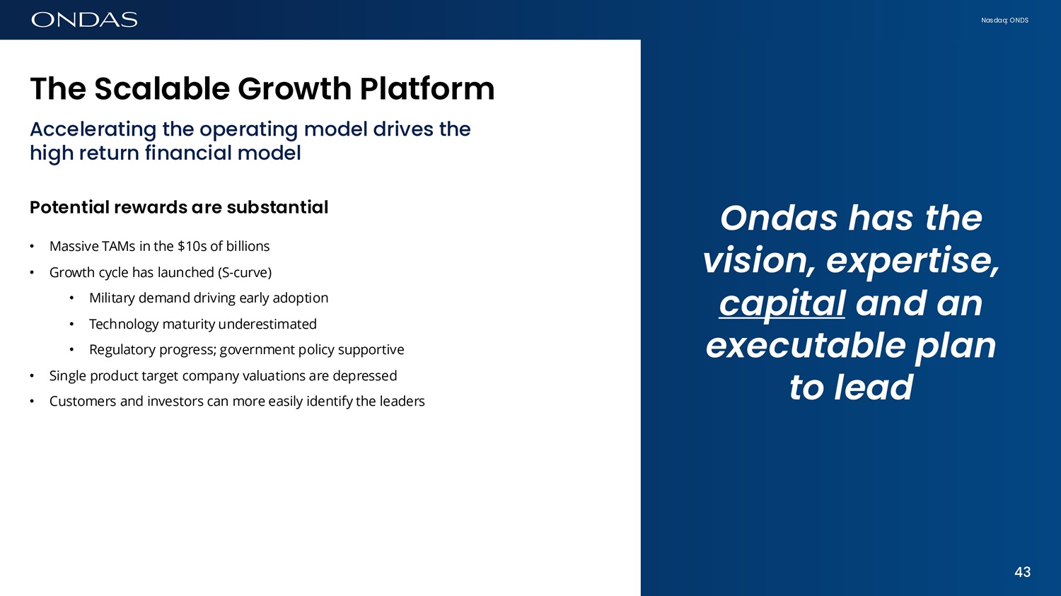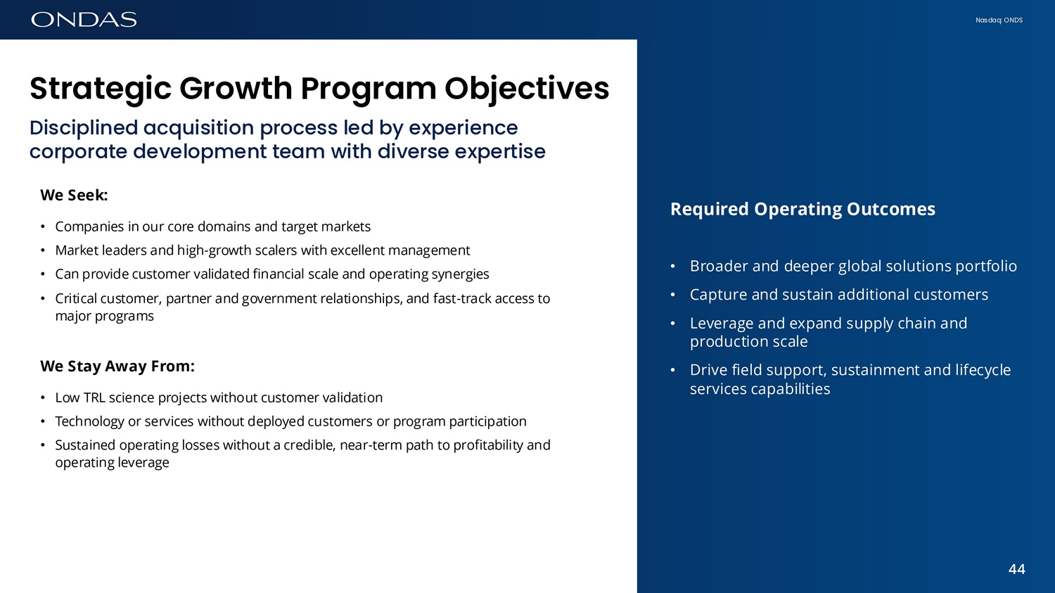 Nasdaq: ONDS The Sc6l6ble Growth Pl6tform Accelerating the operating model drives the high return financial model Potefiti6l rew6rds 6re subst6fiti6l • Massive TAMs in the $10s of billions • Growth cycle has launched (S - curve) • Military demand driving early adoption • Technology maturity underestimated • Regulatory progress; government policy supportive • Single product target company valuations are depressed • Customers and investors can more easily identify the leaders Ondas has the vision, expertise, capital and an executable plan to lead 43