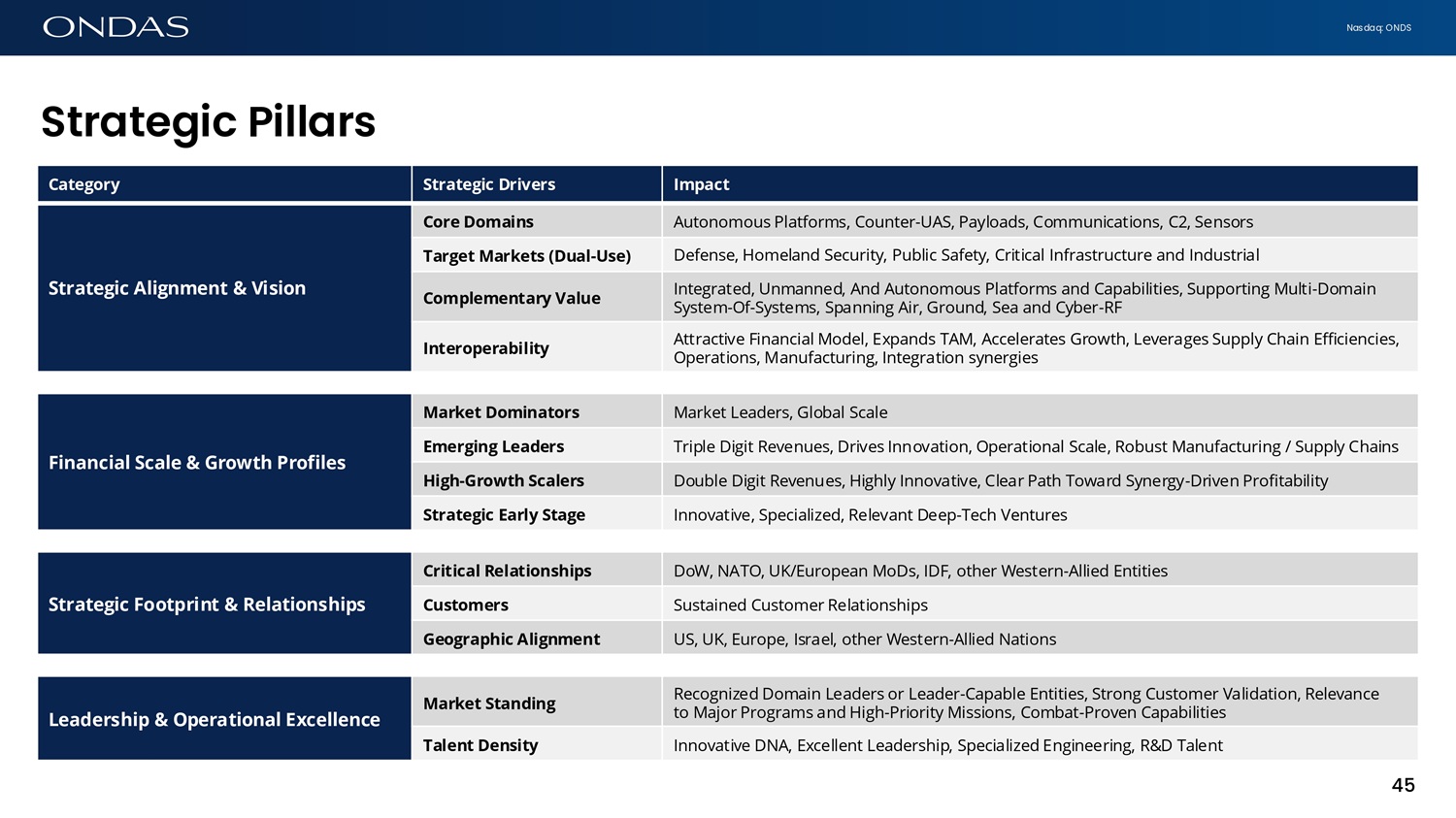 Nasdaq: ONDS Impact Strategic Drivers Category Autonomous Platforms, Counter - UAS, Payloads, Communications, C2, Sensors Core Domains Strategic Alignment & Vision Defense, Homeland Security, Public Safety, Critical Infrastructure and Industrial Target Markets (Dual - Use) Integrated, Unmanned, And Autonomous Platforms and Capabilities, Supporting Multi - Domain System - Of - Systems, Spanning Air, Ground, Sea and Cyber - RF Complementary Value Attractive Financial Model, Expands TAM, Accelerates Growth, Leverages Supply Chain Efficiencies, Operations, Manufacturing, Integration synergies Interoperability Market Leaders, Global Scale Market Dominators Financial Scale & Growth Profiles Triple Digit Revenues, Drives Innovation, Operational Scale, Robust Manufacturing / Supply Chains Emerging Leaders Double Digit Revenues, Highly Innovative, Clear Path Toward Synergy - Driven Profitability High - Growth Scalers Innovative, Specialized, Relevant Deep - Tech Ventures Strategic Early Stage DoW, NATO, UK/European MoDs, IDF, other Western - Allied Entities Critical Relationships Strategic Footprint & Relationships Sustained Customer Relationships Customers US, UK, Europe, Israel, other Western - Allied Nations Geographic Alignment Recognized Domain Leaders or Leader - Capable Entities, Strong Customer Validation, Relevance to Major Programs and High - Priority Missions, Combat - Proven Capabilities Market Standing Leadership & Operational Excellence Innovative DNA, Excellent Leadership, Specialized Engineering, R&D Talent Talent Density 45 Str6tegic Pill6rs