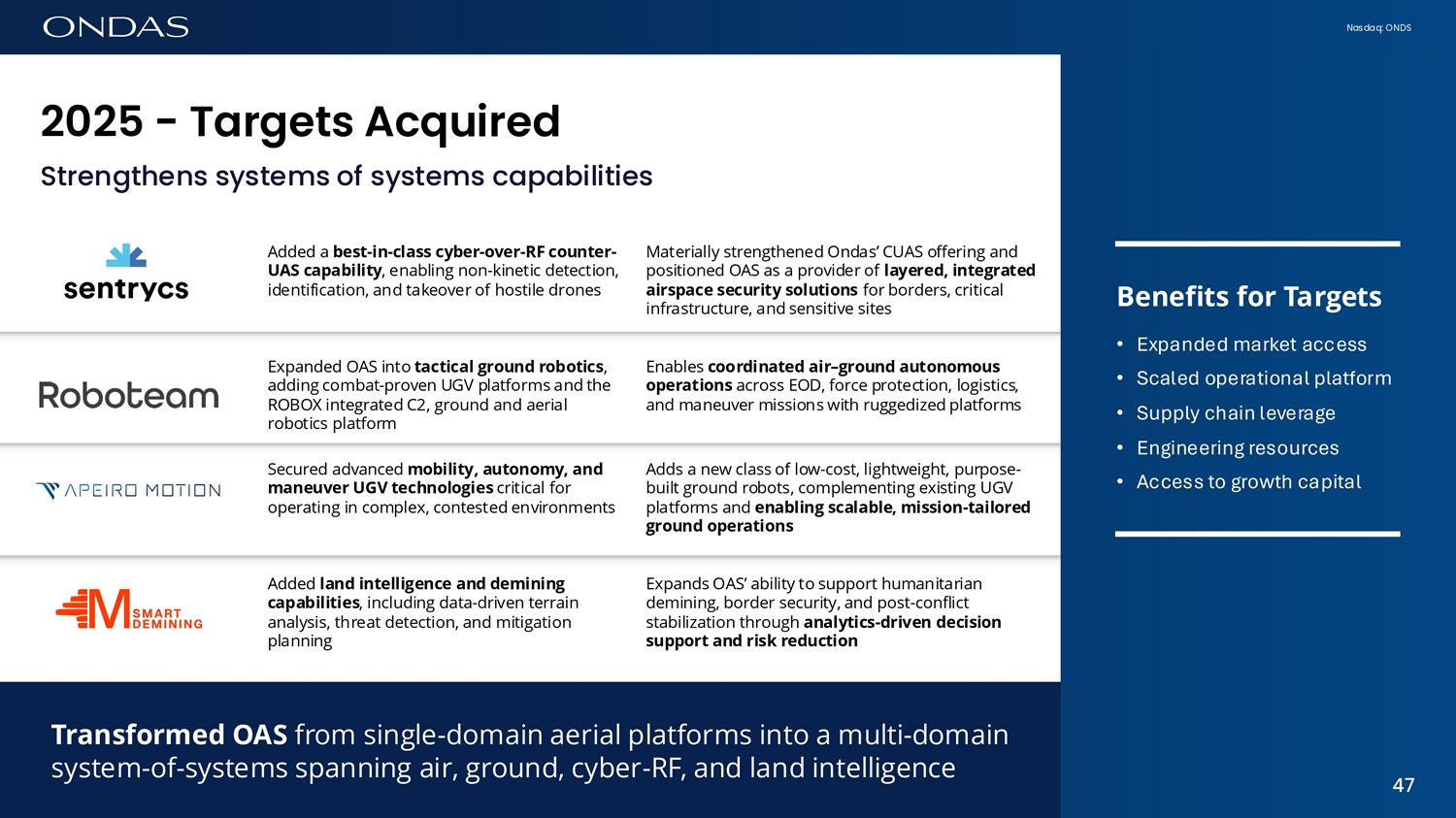 Nasdaq: ONDS 47 Added a best - in - class cyber - over - RF counter - UAS capability , enabling non - kinetic detection, identification, and takeover of hostile drones Materially strengthened Ondas’ CUAS offering and positioned OAS as a provider of layered, integrated airspace security solutions for borders, critical infrastructure, and sensitive sites Expanded OAS into tactical ground robotics , adding combat - proven UGV platforms and the ROBOX integrated C2, ground and aerial robotics platform Enables coordinated air – ground autonomous operations across EOD, force protection, logistics, and maneuver missions with ruggedized platforms Secured advanced mobility, autonomy, and maneuver UGV technologies critical for operating in complex, contested environments Adds a new class of low - cost, lightweight, purpose - built ground robots, complementing existing UGV platforms and enabling scalable, mission - tailored ground operations Added land intelligence and demining capabilities , including data - driven terrain analysis, threat detection, and mitigation planning Expands OAS’ ability to support humanitarian demining, border security, and post - conflict stabilization through analytics - driven decision support and risk reduction Benefits for Targets • Expanded market access • Scaled operational platform • Supply chain leverage • Engineering resources • Access to growth capital Transformed OAS from single - domain aerial platforms into a multi - domain system - of - systems spanning air, ground, cyber - RF, and land intelligence 47 2025 - T6rgets Acquired Strengthens systems of systems capabilities