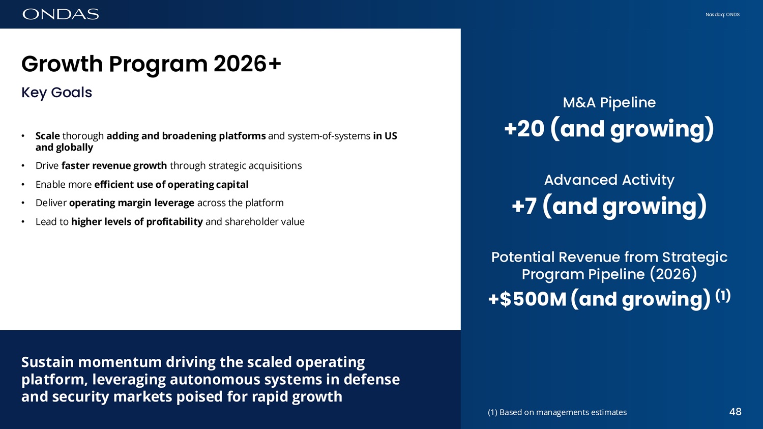 Nasdaq: ONDS Growth Progr6m 2026+ Key Goals • Scale thorough adding and broadening platforms and system - of - systems in US and globally • Drive faster revenue growth through strategic acquisitions • Enable more efficient use of operating capital • Deliver operating margin leverage across the platform • Lead to higher levels of profitability and shareholder value M&A Pipeline +20 (and growing) Advanced Activity +7 (and growing) Potential Revenue from Strategic Program Pipeline (2026) +$500M (and growing) (1) Sustain momentum driving the scaled operating platform, leveraging autonomous systems in defense and security markets poised for rapid growth 48 (1) Based on managements estimates