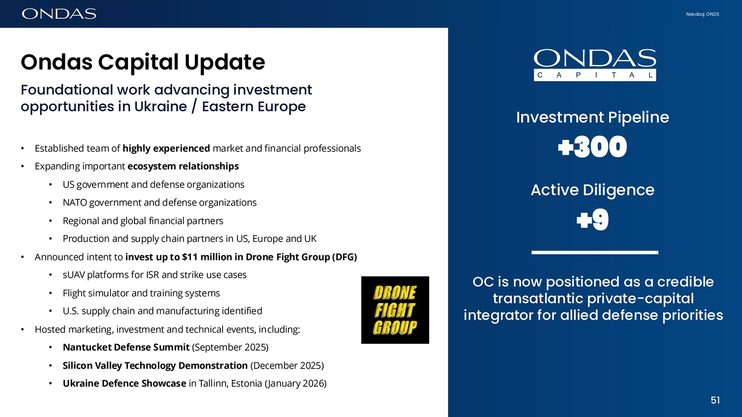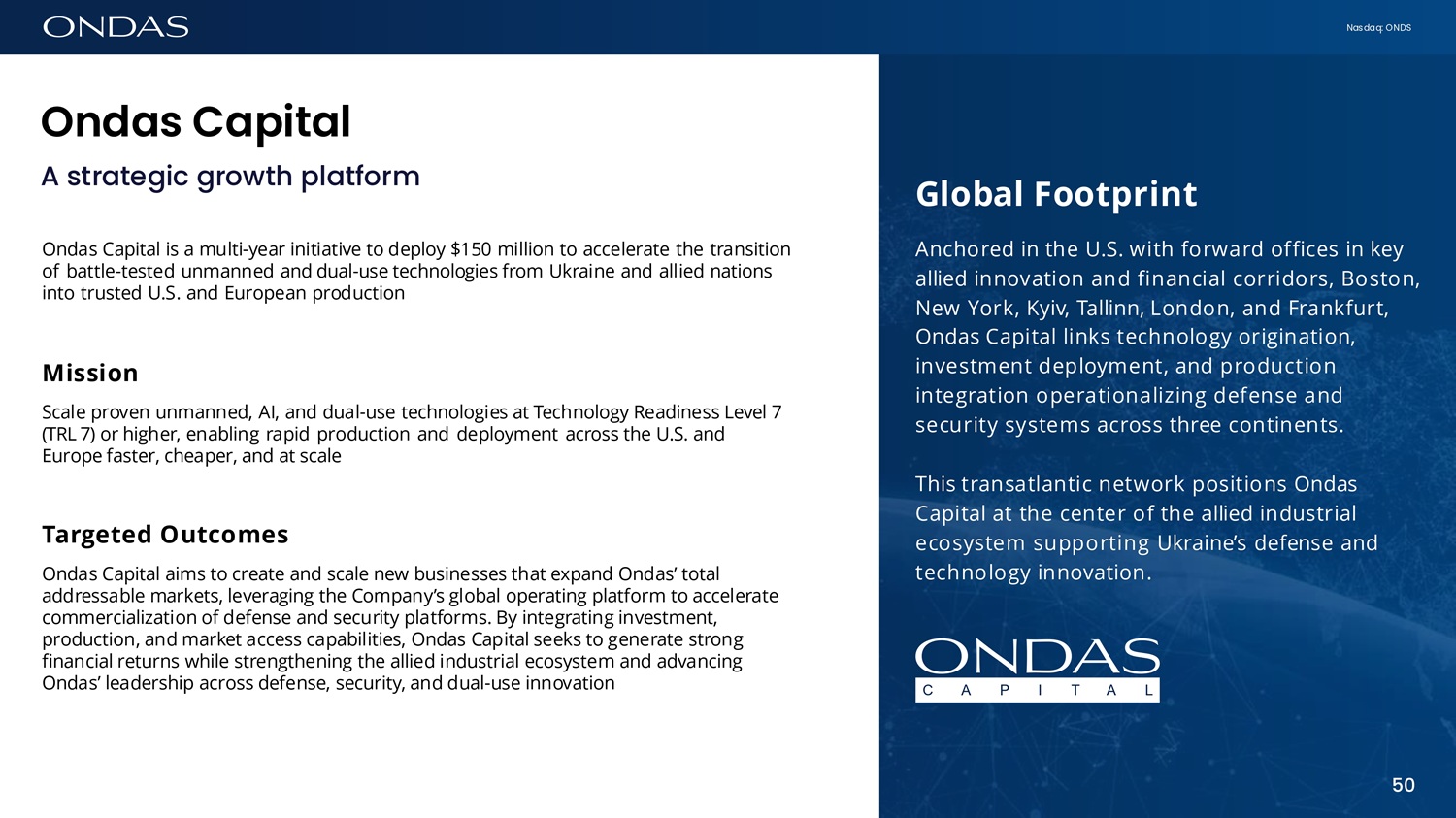 Nasdaq: ONDS Ofid6s C6pit6l A strategic growth platform Ondas Capital is a multi - year initiative to deploy $150 million to accelerate the transition of battle - tested unmanned and dual - use technologies from Ukraine and allied nations into trusted U.S. and European production Mission Scale proven unmanned, AI, and dual - use technologies at Technology Readiness Level 7 (TRL 7) or higher, enabling rapid production and deployment across the U.S. and Europe faster, cheaper, and at scale Targeted Outcomes Ondas Capital aims to create and scale new businesses that expand Ondas’ total addressable markets, leveraging the Company’s global operating platform to accelerate commercialization of defense and security platforms. By integrating investment, production, and market access capabilities, Ondas Capital seeks to generate strong financial returns while strengthening the allied industrial ecosystem and advancing Ondas’ leadership across defense, security, and dual - use innovation Global Footprint Anchored in the U.S. with forward offices in key allied innovation and financial corridors, Boston, New York, Kyiv, Tallinn, London, and Frankfurt, Ondas Capital links technology origination, investment deployment, and production integration operationalizing defense and security systems across three continents. This transatlantic network positions Ondas Capital at the center of the allied industrial ecosystem supporting Ukraine’s defense and technology innovation. C A P l T A L 50
