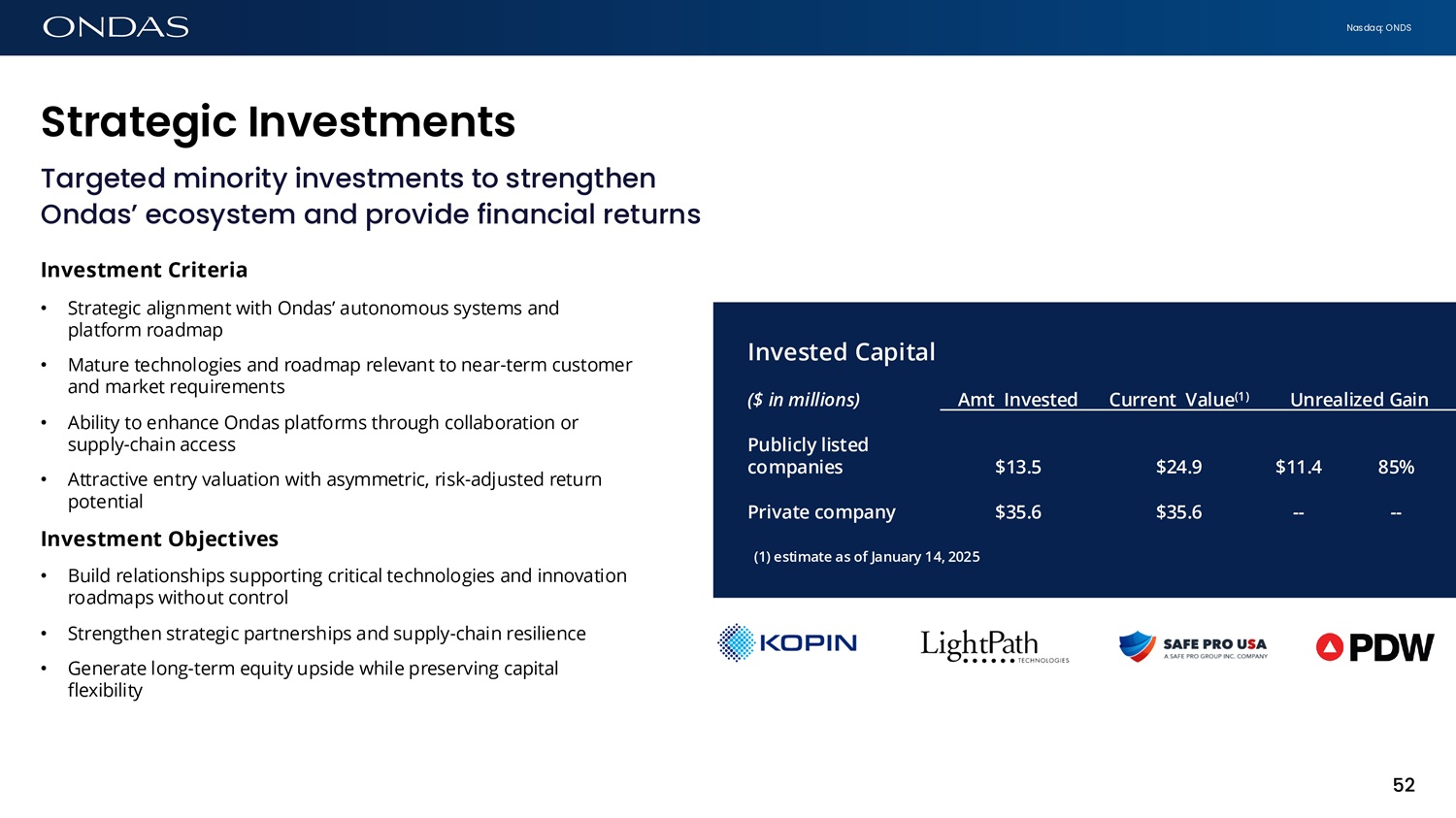 Nasdaq: ONDS Ofid6s C6pit6l Upd6te Foundational work advancing investment opportunities in Ukraine / Eastern Europe • Established team of highly experienced market and financial professionals • Expanding important ecosystem relationships • US government and defense organizations • NATO government and defense organizations • Regional and global financial partners • Production and supply chain partners in US, Europe and UK • Announced intent to invest up to $11 million in Drone Fight Group (DFG) • sUAV platforms for ISR and strike use cases • Flight simulator and training systems • U.S. supply chain and manufacturing identified • Hosted marketing, investment and technical events, including: • Nantucket Defense Summit (September 2025) • Silicon Valley Technology Demonstration (December 2025) • Ukraine Defence Showcase in Tallinn, Estonia (January 2026) Investment Pipeline +300 Active Diligence +9 OC is now positioned as a credible transatlantic private - capital integrator for allied defense priorities C A P l T A L 51