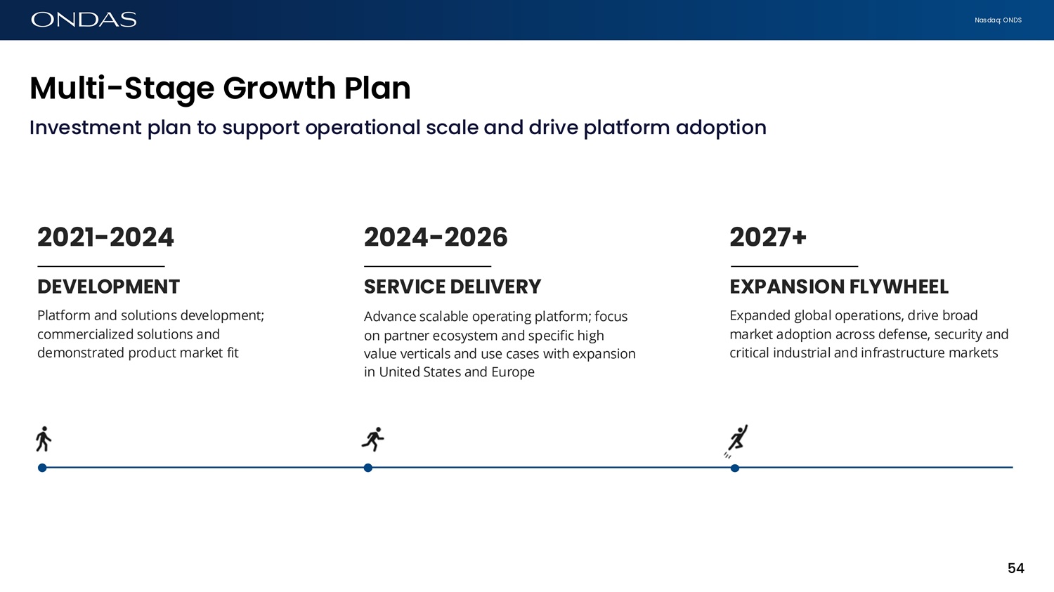 Nasdaq: ONDS 2021 - 2024 DEVELOPMENT Platform and solutions development; commercialized solutions and demonstrated product market fit 2024 - 2026 SERVICE DELIVERY Advance scalable operating platform; focus on partner ecosystem and specific high value verticals and use cases with expansion in United States and Europe 2027+ EXPANSION FLYWHEEL Expanded global operations, drive broad market adoption across defense, security and critical industrial and infrastructure markets 54 Multi - St6ge Growth Pl6fi Investment plan to support operational scale and drive platform adoption