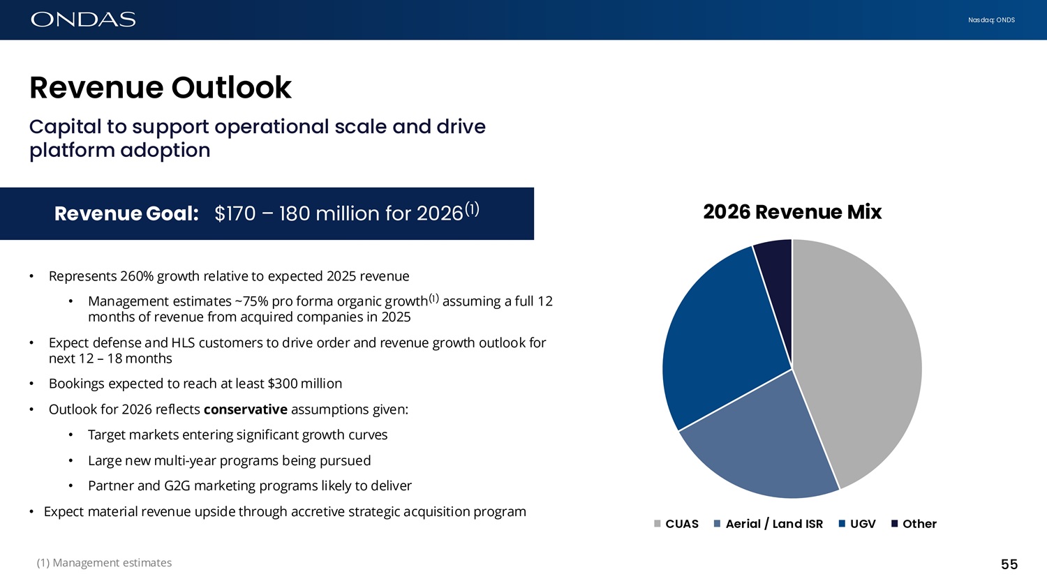 Nasdaq: ONDS 55 Revefiue Outlook Capital to support operational scale and drive platform adoption • Represents 260% growth relative to expected 2025 revenue • Management estimates ~75% pro forma organic growth (1) assuming a full 12 months of revenue from acquired companies in 2025 • Expect defense and HLS customers to drive order and revenue growth outlook for next 12 – 18 months • Bookings expected to reach at least $300 million • Outlook for 2026 reflects conservative assumptions given: • Target markets entering significant growth curves • Large new multi - year programs being pursued • Partner and G2G marketing programs likely to deliver • Expect material revenue upside through accretive strategic acquisition program Revenue Goal: $170 – 180 million for 2026 (1) 2026 Revenue Mix CUAS Aeri6l / L6fid ISR UGV Other (1) Management estimates