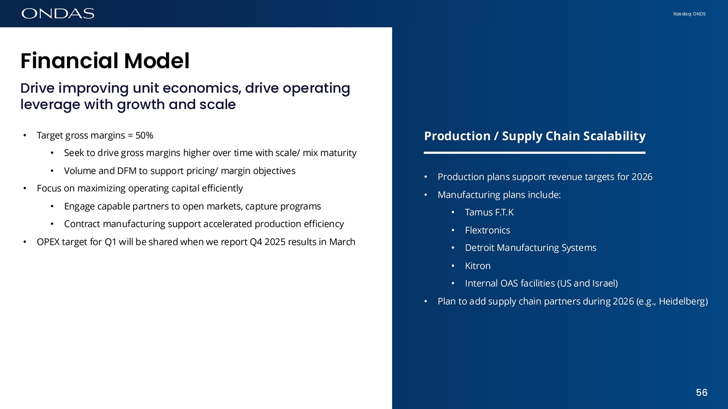 Nasdaq: ONDS Fifi6fici6l Model Drive improving unit economics, drive operating leverage with growth and scale • Target gross margins = 50% • Seek to drive gross margins higher over time with scale/ mix maturity • Volume and DFM to support pricing/ margin objectives • Focus on maximizing operating capital efficiently • Engage capable partners to open markets, capture programs • Contract manufacturing support accelerated production efficiency • OPEX target for Q1 will be shared when we report Q4 2025 results in March Production / Supply Chain Scalability • Production plans support revenue targets for 2026 • Manufacturing plans include: • Tamus F.T.K • Flextronics • Detroit Manufacturing Systems • Kitron • Internal OAS facilities (US and Israel) • Plan to add supply chain partners during 2026 (e.g., Heidelberg) 56