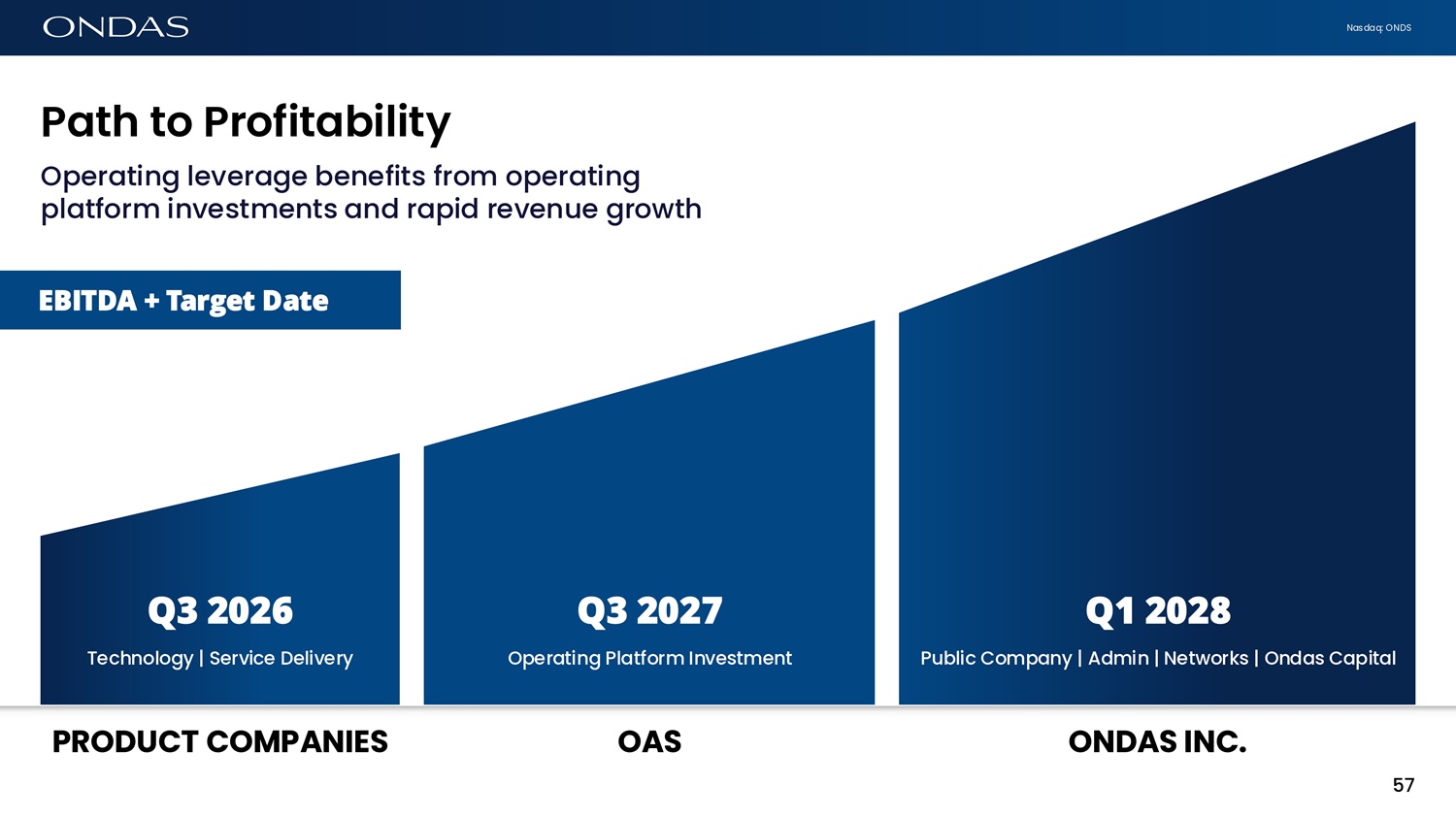 Nasdaq: ONDS Q3 2026 Technology | Service Delivery Q3 2027 Operating Platform Investment Q1 2028 Public Company | Admin | Networks | Ondas Capital 57 Operating leverage benefits from operating platform investments and rapid revenue growth P6th to Profit6bility PRODUCT COMPANIES OAS ONDAS INC. EBITDA + Target Date