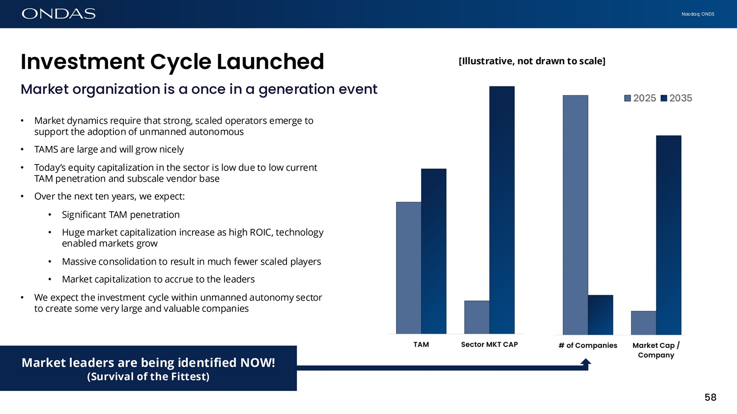 Nasdaq: ONDS Ifivestmefit Cycle L6ufiched Market organization is a once in a generation event • Market dynamics require that strong, scaled operators emerge to support the adoption of unmanned autonomous • TAMS are large and will grow nicely • Today’s equity capitalization in the sector is low due to low current TAM penetration and subscale vendor base • Over the next ten years, we expect: • Significant TAM penetration • Huge market capitalization increase as high ROIC, technology enabled markets grow • Massive consolidation to result in much fewer scaled players • Market capitalization to accrue to the leaders • We expect the investment cycle within unmanned autonomy sector to create some very large and valuable companies [Illustrative, not drawn to scale] 58 Market leaders are being identified NOW! (Survival of the Fittest)