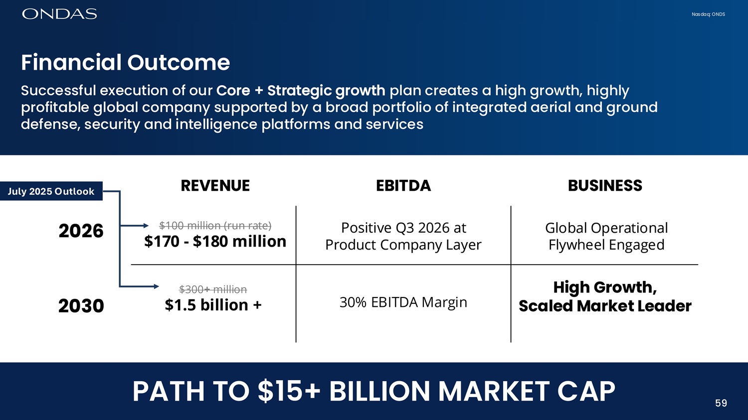 Nasdaq: ONDS 59 Fifi6fici6l Outcome Successful execution of our Core + Strategic growth plan creates a high growth, highly profitable global company supported by a broad portfolio of integrated aerial and ground defense, security and intelligence platforms and services PATH TO $15+ BILLION MARKET CAP July 2025 Outlook $300 + million $1.5 billion + 30% EBITDA Margin 2026 2030 High Growth, Scaled Market Leader Global Operational Flywheel Engaged BUSINESS REVENUE $100 million (run rate) $170 - $180 million EBITDA Positive Q3 2026 at Product Company Layer 59