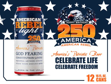 American Rebel Light Beer’s 250th Anniversary Patriot Pack celebrates 250 years of American independence. Bold patriotic icons and the company’s “EST 1776” emblem make the limited-edition packaging a collectible tribute to America’s 250th Birthday Celebration. This premium light lager fills a void in the domestic beer market for a brew that consumers can enjoy “without compromising their taste or their values,” reflecting American Rebel’s core mission.