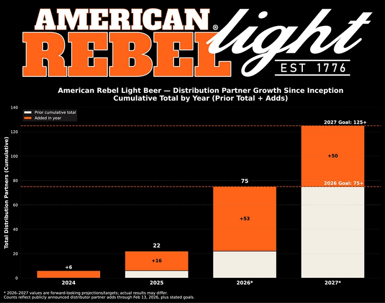 NASHVILLE, Tenn., Feb. 19, 2026 (GLOBE NEWSWIRE) — American Rebel Holdings, Inc. (NASDAQ: AREB) (“American Rebel” or the “Company”), America’s Patriotic Brand™, today issued a comprehensive launch-to-today recap for American Rebel Light Beer, highlighting key milestones since the Company announced its expansion into the beverage industry in October 2023 through the brand’s accelerating distribution footprint and retail momentum in 2025 and early 2026.