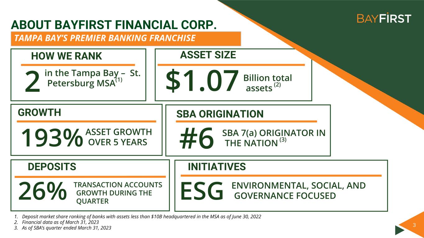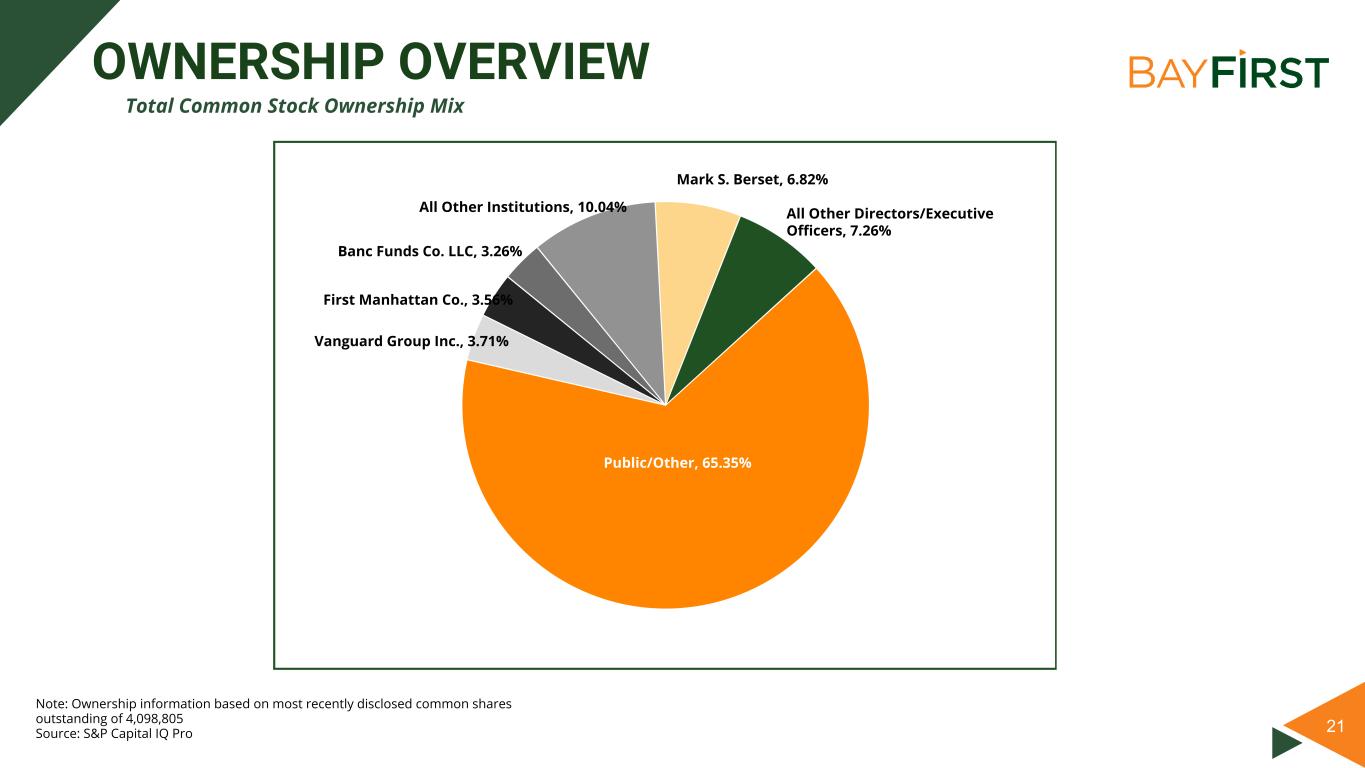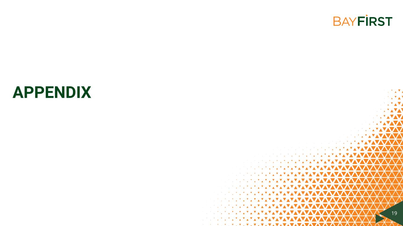 Divider + Image Click image icon to insert rectangular image. No content below the lineNo content below the line Only use S&P Global Red for key text high- lights, not shapes or charts. It’s available in the custom color palette. Footer : Never change the footer text on individual slides. Change, turn on or off footer by using Insert Header & Footer Enter / change text Click Apply All. Data color order: Used with accent colors: Complimentary colors: Font: Follow the link below to download Akkurat, the S&P Global Font: https:// mediaportal.spglobal.c om/ selection/044f0784c26 0101db38e31ccde3bbe ff/detail/28188 18 KEY INVESTMENT POINTS Second largest community bank (deposits) based in attractive Tampa Bay market area Total asset growth of 193% since YE2017 Innovative technology driven bank planning for the future of banking Among the nation’s top SBA loan generators Solid deposit growth of 17% for the quarter and 21% since same period last year Experienced management team with strong insider ownership of 14% ✔ ✔ ✔ ✔ ✔ ✔ ✔ Consistent dividend growing 100% over past 5 years
