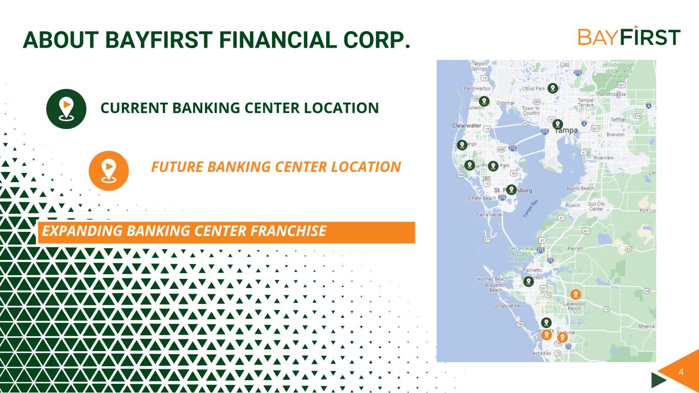 3 ABOUT BAYFIRST FINANCIAL CORP. TAMPA BAY’S PREMIER BANKING FRANCHISE in the Tampa Bay – St. Petersburg MSA(1) HOW WE RANK 2 ASSET SIZE Billion total assets (2)$1.07 SBA ORIGINATION SBA 7(a) ORIGINATOR IN THE NATION (3) #6 GROWTH ASSET GROWTH OVER 5 YEARS193% 1. Deposit market share ranking of banks with assets less than $10B headquartered in the MSA as of June 30, 2022 2. Financial data as of March 31, 2023 3. As of SBA’s quarter ended March 31, 2023 INITIATIVES ENVIRONMENTAL, SOCIAL, AND GOVERNANCE FOCUSED ESG DEPOSITS 26% TRANSACTION ACCOUNTS GROWTH DURING THE QUARTER