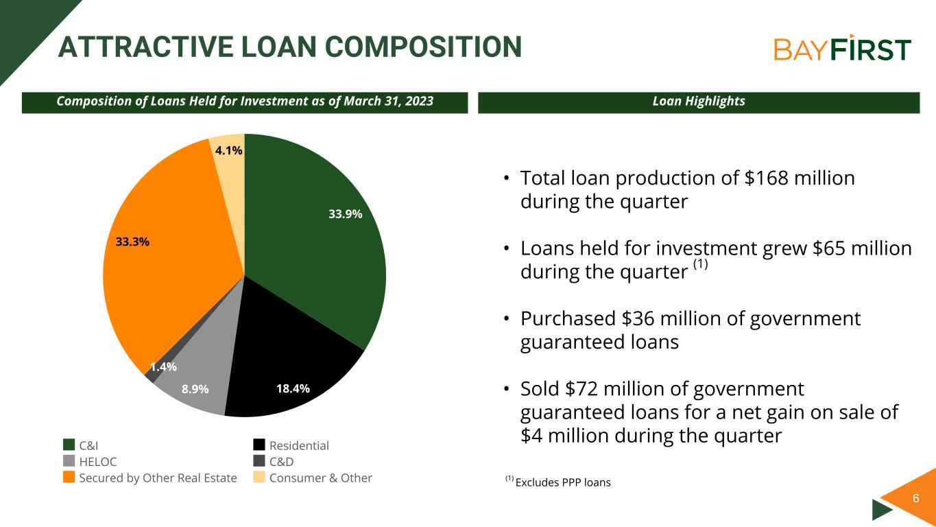 5 • Advanced technology platform to support innovative products and services while improving efficiencies • PowerLOS for government guaranteed and commercial lending platform • Working with FinTechs to offer new and innovative services through Mulesoft API platform • 9 banking centers in Tampa Bay, expected to grow to 12 banking centers over the next two years to three years ▪ 10 commercial and 4 consumer loan production officers • Full suite of commercial and consumer loan and deposit products to meet the needs of Tampa Bay individuals, families and small businesses • BayFirst’s in-house government guaranteed lending platform • #6 SBA lender in dollars and #3 in units as of SBA's quarter ended 3/31/2023 • #1 SBA lender in the five county Tampa Bay area at SBA’s FY ended 9/30/22 • FlashCap program: ▪ SBA 7(a) loans of $350K or less ▪ Includes BOLT SBA 7(a) loans for $150K or less, with 85% government guarantee • Core program: ▪ Focuses on $350K and above, and is anchored by 10 experienced core lenders ▪ Loan generation from organic sales and FinTech partners COMMUNITY BANKING TECHNOLOGY DRIVEN INNOVATIVE COMMUNITY BANK Technology driven community bank with diversified revenue streams CREDITBENCH