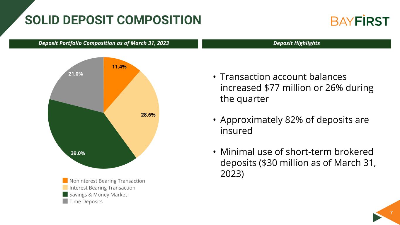 6 ATTRACTIVE LOAN COMPOSITION Composition of Loans Held for Investment as of March 31, 2023 33.9% 18.4%8.9% 1.4% 33.3% 4.1% C&I Residential HELOC C&D Secured by Other Real Estate Consumer & Other Loan Highlights • Total loan production of $168 million during the quarter • Loans held for investment grew $65 million during the quarter (1) • Purchased $36 million of government guaranteed loans • Sold $72 million of government guaranteed loans for a net gain on sale of $4 million during the quarter (1) Excludes PPP loans