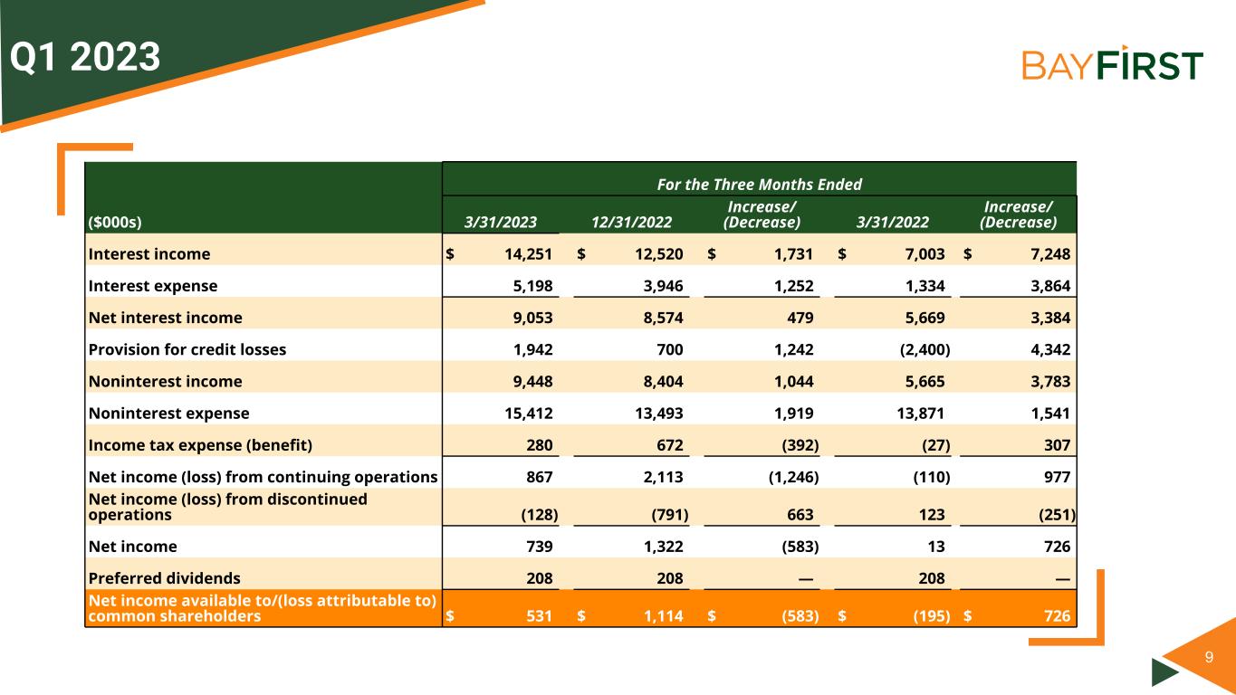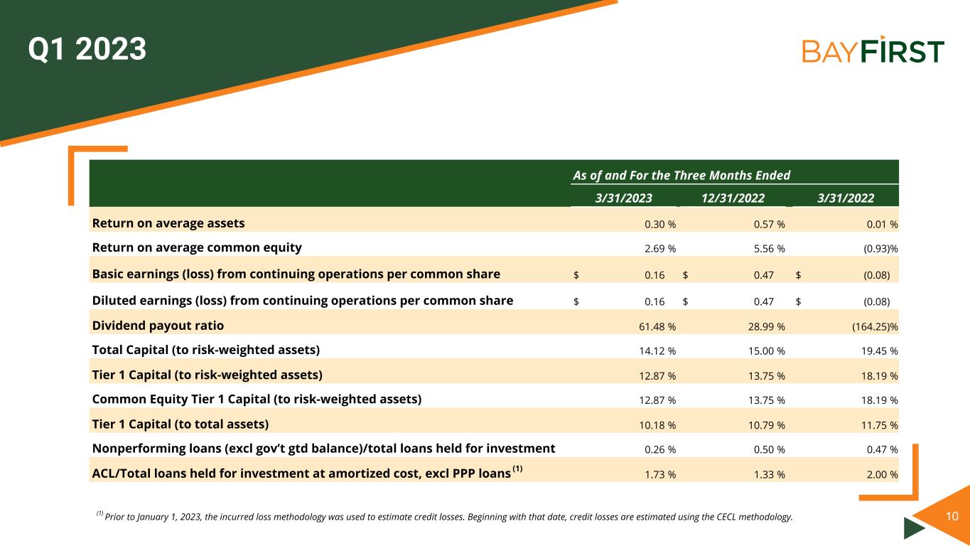9 Q1 2023 For the Three Months Ended ($000s) 3/31/2023 12/31/2022 Increase/ (Decrease) 3/31/2022 Increase/ (Decrease) Interest income $ 14,251 $ 12,520 $ 1,731 $ 7,003 $ 7,248 Interest expense 5,198 3,946 1,252 1,334 3,864 Net interest income 9,053 8,574 479 5,669 3,384 Provision for credit losses 1,942 700 1,242 (2,400) 4,342 Noninterest income 9,448 8,404 1,044 5,665 3,783 Noninterest expense 15,412 13,493 1,919 13,871 1,541 Income tax expense (benefit) 280 672 (392) (27) 307 Net income (loss) from continuing operations 867 2,113 (1,246) (110) 977 Net income (loss) from discontinued operations (128) (791) 663 123 (251) Net income 739 1,322 (583) 13 726 Preferred dividends 208 208 — 208 — Net income available to/(loss attributable to) common shareholders $ 531 $ 1,114 $ (583) $ (195) $ 726