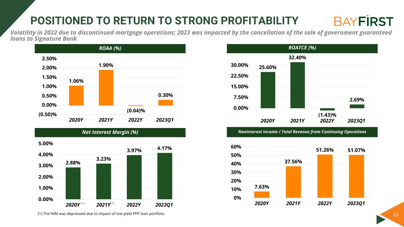 Divider + Image Click image icon to insert rectangular image. No content below the lineNo content below the line Only use S&P Global Red for key text high- lights, not shapes or charts. It’s available in the custom color palette. Footer : Never change the footer text on individual slides. Change, turn on or off footer by using Insert Header & Footer Enter / change text Click Apply All. Data color order: Used with accent colors: Complimentary colors: Font: Follow the link below to download Akkurat, the S&P Global Font: https:// mediaportal.spglobal.c om/ selection/044f0784c26 0101db38e31ccde3bbe ff/detail/28188 12 LIQUIDITY SOURCES • Available Liquidity ◦ $137 million in cash and due from other banks ◦ $42 million in AFS investment securities • Off Balance Sheet Sources of Liquidity ◦ $131 million of unused, available borrowing capacity at the FHLB based on pledged loans ◦ $41 million available at the Federal Reserve Bank based on pledged loans ◦ $40 million in available Fed Funds borrowing lines from other banks • Contingent Sources ◦ Up to $130 million in brokered deposits (1) ◦ Up to $309 million in listing service deposits (1) (1) Based on Bank’s policy limits Data as of March 31, 2023 (unaudited)