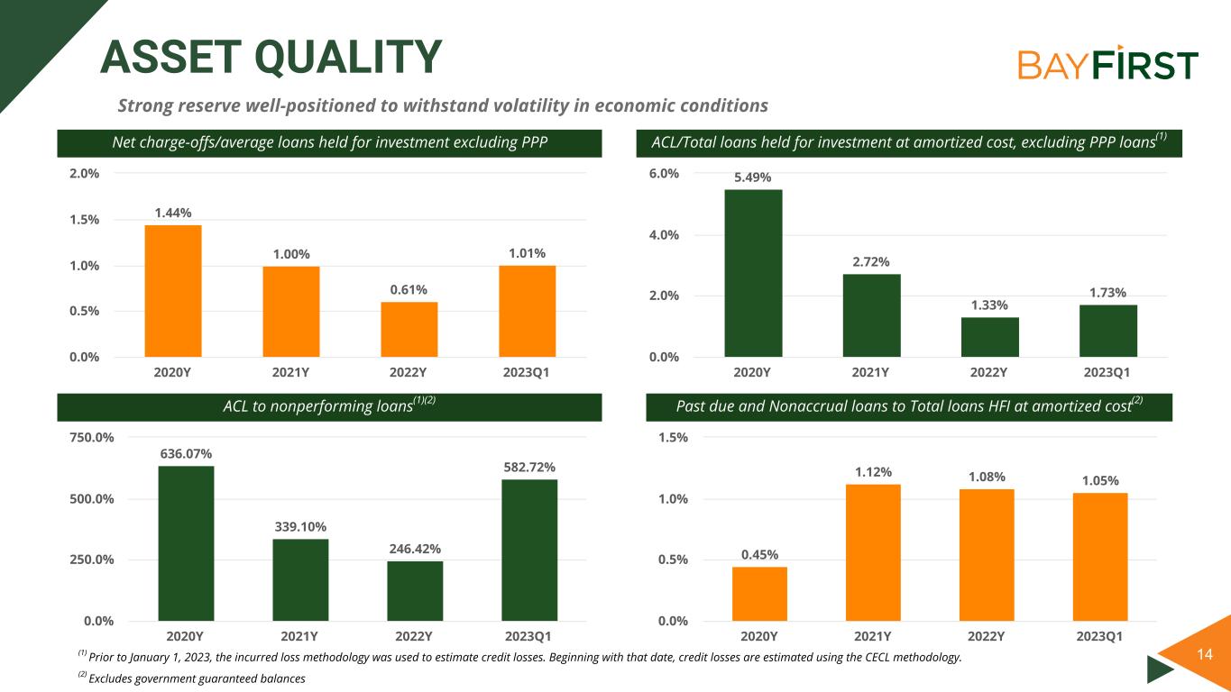 13 POSITIONED TO RETURN TO STRONG PROFITABILITY ROAA (%) ROATCE (%) Net Interest Margin (%) Noninterest Income / Total Revenue from Continuing Operations Volatility in 2022 due to discontinued mortgage operations; 2023 was impacted by the cancellation of the sale of government guaranteed loans to Signature Bank (1) The NIM was depressed due to impact of low yield PPP loan portfolio 1.06% 1.90% (0.04)% 0.30% 2020Y 2021Y 2022Y 2023Q1 (0.50)% 0.00% 0.50% 1.00% 1.50% 2.00% 2.50% 25.60% 32.40% (1.43)% 2.69% 2020Y 2021Y 2022Y 2023Q1 0.00% 7.50% 15.00% 22.50% 30.00% 2.88% 3.23% 3.97% 4.17% 2020Y 2021Y 2022Y 2023Q1 0.00% 1.00% 2.00% 3.00% 4.00% 5.00% (1)(1) 7.63% 37.56% 51.26% 51.07% 2020Y 2021Y 2022Y 2023Q1 0% 10% 20% 30% 40% 50% 60%