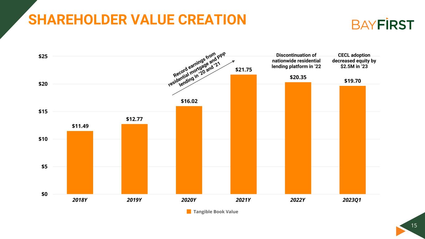 14 ASSET QUALITY Strong reserve well-positioned to withstand volatility in economic conditions 1.44% 1.00% 0.61% 1.01% 2020Y 2021Y 2022Y 2023Q1 0.0% 0.5% 1.0% 1.5% 2.0% Net charge-offs/average loans held for investment excluding PPP ACL/Total loans held for investment at amortized cost, excluding PPP loans(1) 5.49% 2.72% 1.33% 1.73% 2020Y 2021Y 2022Y 2023Q1 0.0% 2.0% 4.0% 6.0% ACL to nonperforming loans(1)(2) Past due and Nonaccrual loans to Total loans HFI at amortized cost(2) 636.07% 339.10% 246.42% 582.72% 2020Y 2021Y 2022Y 2023Q1 0.0% 250.0% 500.0% 750.0% 0.45% 1.12% 1.08% 1.05% 2020Y 2021Y 2022Y 2023Q1 0.0% 0.5% 1.0% 1.5% (2) Excludes government guaranteed balances (1) Prior to January 1, 2023, the incurred loss methodology was used to estimate credit losses. Beginning with that date, credit losses are estimated using the CECL methodology.