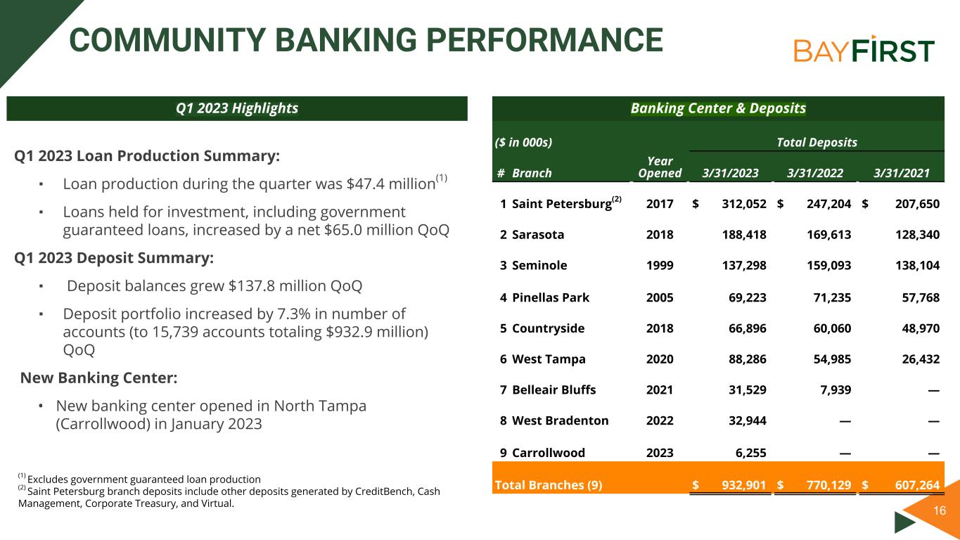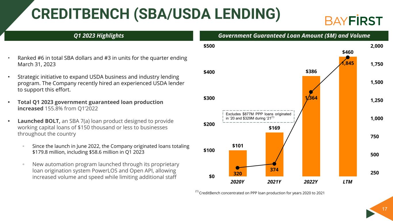 16 COMMUNITY BANKING PERFORMANCE Q1 2023 Loan Production Summary: ▪ Loan production during the quarter was $47.4 million(1) ▪ Loans held for investment, including government guaranteed loans, increased by a net $65.0 million QoQ Q1 2023 Deposit Summary: ▪ Deposit balances grew $137.8 million QoQ ▪ Deposit portfolio increased by 7.3% in number of accounts (to 15,739 accounts totaling $932.9 million) QoQ New Banking Center: • New banking center opened in North Tampa (Carrollwood) in January 2023 Q1 2023 Highlights Banking Center & Deposits ($ in 000s) Total Deposits # Branch Year Opened 3/31/2023 3/31/2022 3/31/2021 1 Saint Petersburg(2) 2017 $ 312,052 $ 247,204 $ 207,650 2 Sarasota 2018 188,418 169,613 128,340 3 Seminole 1999 137,298 159,093 138,104 4 Pinellas Park 2005 69,223 71,235 57,768 5 Countryside 2018 66,896 60,060 48,970 6 West Tampa 2020 88,286 54,985 26,432 7 Belleair Bluffs 2021 31,529 7,939 — 8 West Bradenton 2022 32,944 — — 9 Carrollwood 2023 6,255 — — Total Branches (9) $ 932,901 $ 770,129 $ 607,264 (1) Excludes government guaranteed loan production (2) Saint Petersburg branch deposits include other deposits generated by CreditBench, Cash Management, Corporate Treasury, and Virtual.