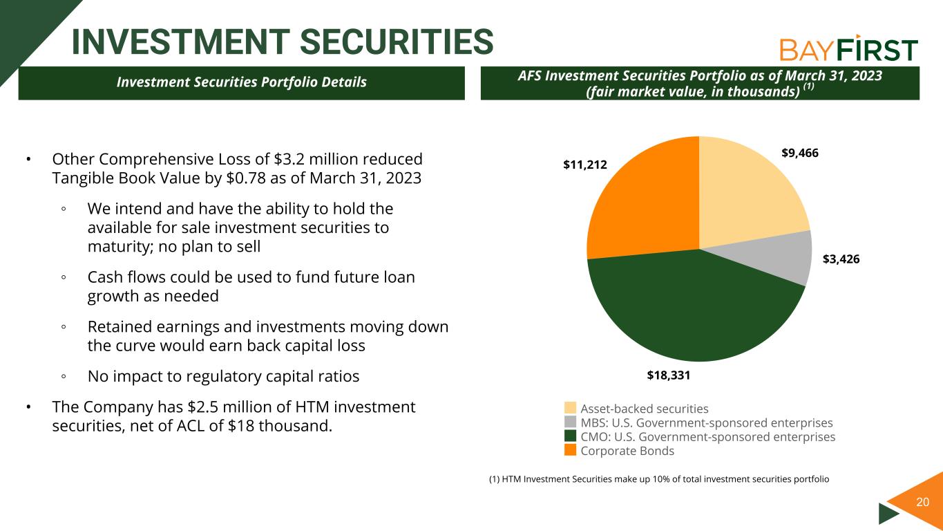 20 INVESTMENT SECURITIES AFS Investment Securities Portfolio as of March 31, 2023 (fair market value, in thousands) (1)Investment Securities Portfolio Details • Other Comprehensive Loss of $3.2 million reduced Tangible Book Value by $0.78 as of March 31, 2023 ◦ We intend and have the ability to hold the available for sale investment securities to maturity; no plan to sell ◦ Cash flows could be used to fund future loan growth as needed ◦ Retained earnings and investments moving down the curve would earn back capital loss ◦ No impact to regulatory capital ratios • The Company has $2.5 million of HTM investment securities, net of ACL of $18 thousand. (1) HTM Investment Securities make up 10% of total investment securities portfolio $9,466 $3,426 $18,331 $11,212 Asset-backed securities MBS: U.S. Government-sponsored enterprises CMO: U.S. Government-sponsored enterprises Corporate Bonds
