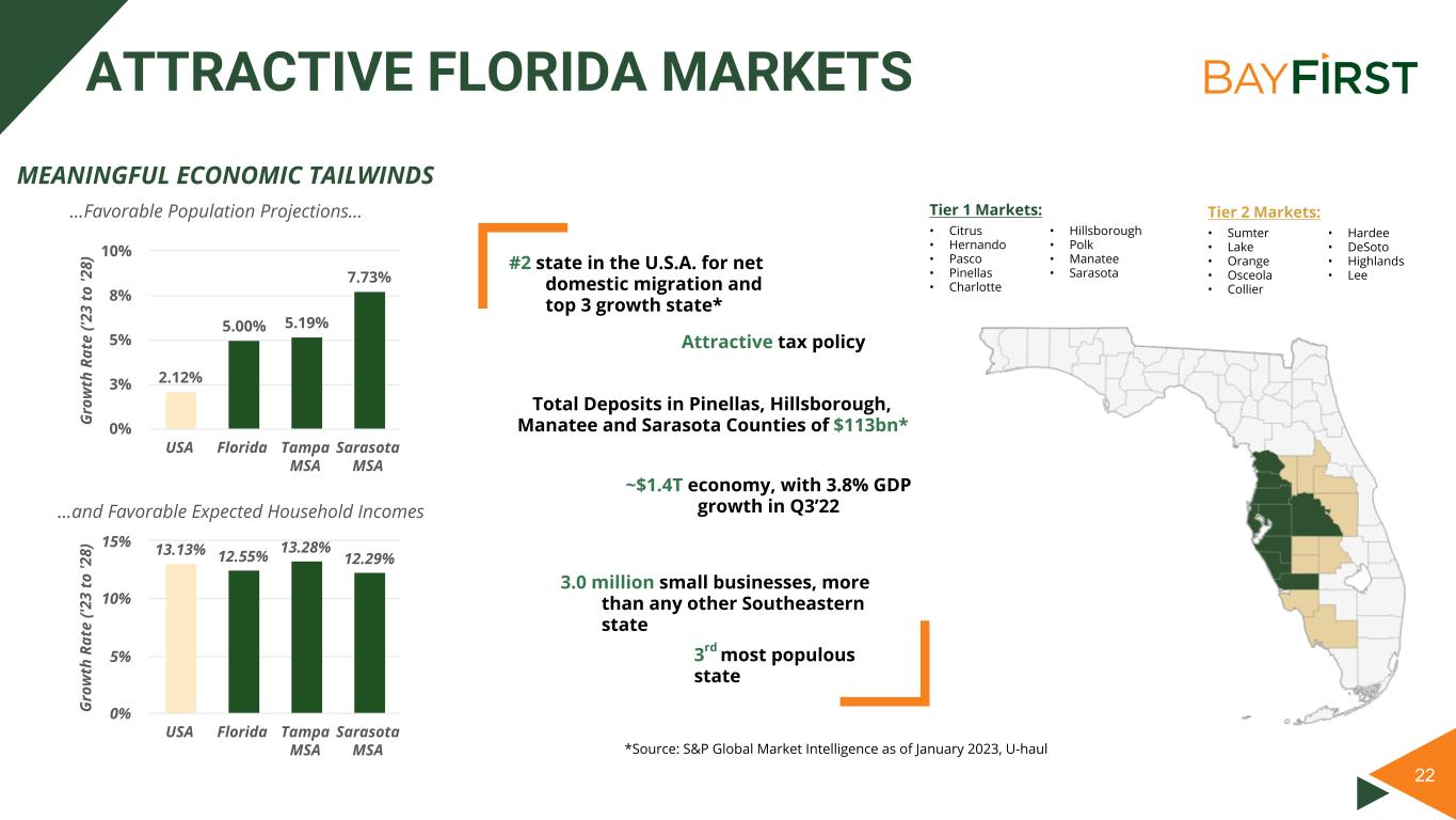 22 ATTRACTIVE FLORIDA MARKETS MEANINGFUL ECONOMIC TAILWINDS #2 state in the U.S.A. for net domestic migration and top 3 growth state* ~$1.4T economy, with 3.8% GDP growth in Q3’22 Attractive tax policy 3.0 million small businesses, more than any other Southeastern state 3rd most populous state Total Deposits in Pinellas, Hillsborough, Manatee and Sarasota Counties of $113bn* …Favorable Population Projections… …and Favorable Expected Household Incomes Tier 1 Markets: • Citrus • Hernando • Pasco • Pinellas • Charlotte • Hillsborough • Polk • Manatee • Sarasota Tier 2 Markets: • Sumter • Lake • Orange • Osceola • Collier • Hardee • DeSoto • Highlands • Lee *Source: S&P Global Market Intelligence as of January 2023, U-haul G ro w th R at e ('2 3 to '2 8) 2.12% 5.00% 5.19% 7.73% USA Florida Tampa MSA Sarasota MSA 0% 3% 5% 8% 10% G ro w th R at e ('2 3 to '2 8) 13.13% 12.55% 13.28% 12.29% USA Florida Tampa MSA Sarasota MSA 0% 5% 10% 15%