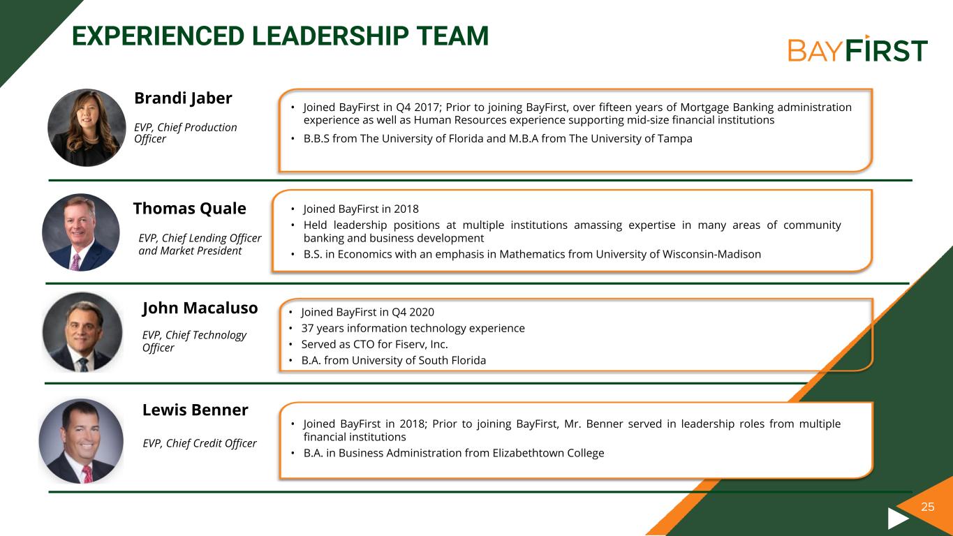 24 EXPERIENCED LEADERSHIP TEAM • Joined BayFirst in Q4 2013; Prior to joining BayFirst, provided management consulting and regulatory advisory services to community banks throughout the state of Florida and served as the interim CEO of three troubled banks between 2009 and 2013 • Managing Director and Executive Vice President of Community Banks, Inc. (Nasdaq: CMTY) in Harrisburg, PA from 1993 until its sale to Susquehanna Bancshares, Inc. (NasdaqGS: SUSQ) in 2007 • B.A. in Political Science from George Washington University and a J.D. from George Washington University Law School • Joined BayFirst in Q2 2018; Prior to joining BayFirst, Controller of Central Bank & Trust Co., a $2.5 billion privately held financial institution in Lexington, Kentucky, from May 2014 to June 2018 • Approximately 16 years with Crowe LLP as an auditor in the financial institution practice; served over 80 financial institution clients with assets ranging from $50 million to $4.5 billion throughout career, including several SEC registrants and FDICIA reporting institutions • B.S. in Accounting from the University of Kentucky • Joined BayFirst in Q1 2016 • Previous experience includes Florida Market President of Stearns Bank, SBA Product Manager of HomeBanc, and Community Bank President and SBA President of Republic Bank (MI) • B.A. in Business Administration from University of Notre Dame Anthony N. Leo Robin Oliver Thomas G. Zernick Chief Executive Officer & Director of BayFirst and the Bank EVP, Chief Financial Officer and Chief Operating Officer of BayFirst and the Bank President of BayFirst and the Bank 24