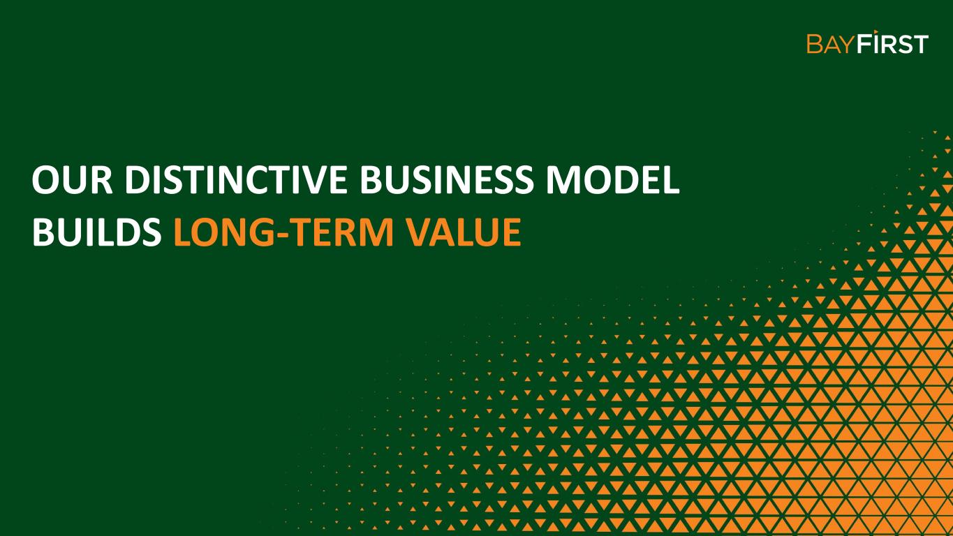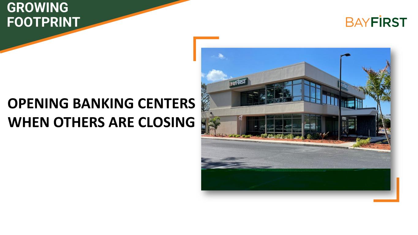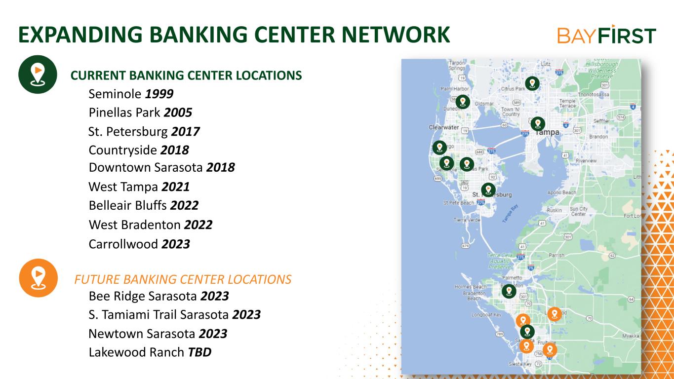 EXPANDING BANKING CENTER NETWORK CURRENT BANKING CENTER LOCATIONS FUTURE BANKING CENTER LOCATIONS Seminole 1999 Pinellas Park 2005 Countryside 2018 St. Petersburg 2017 Downtown Sarasota 2018 West Tampa 2021 Belleair Bluffs 2022 West Bradenton 2022 Carrollwood 2023 Bee Ridge Sarasota 2023 S. Tamiami Trail Sarasota 2023 Lakewood Ranch TBD Newtown Sarasota 2023