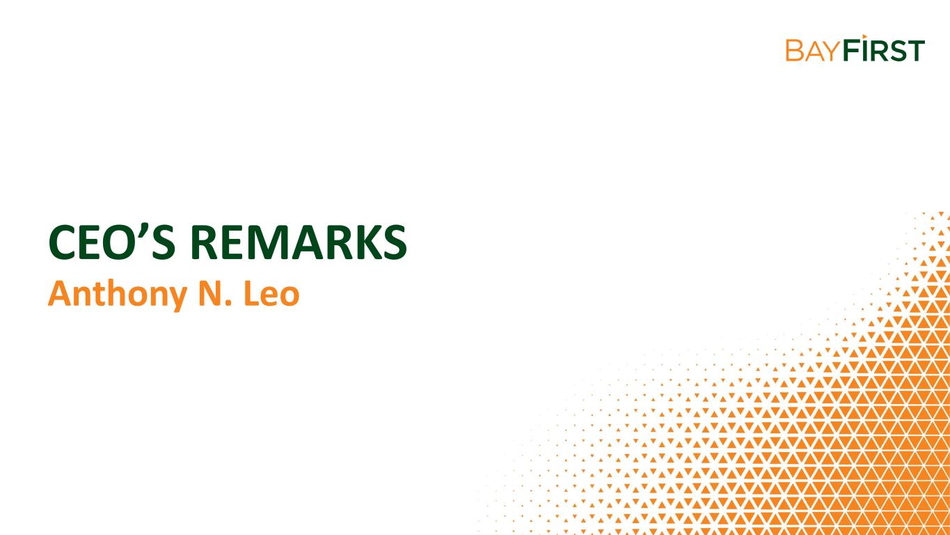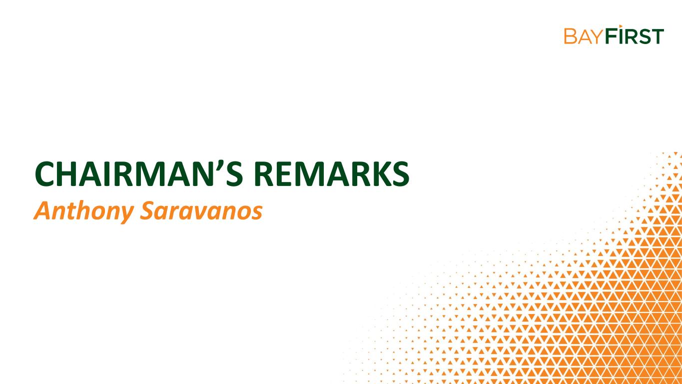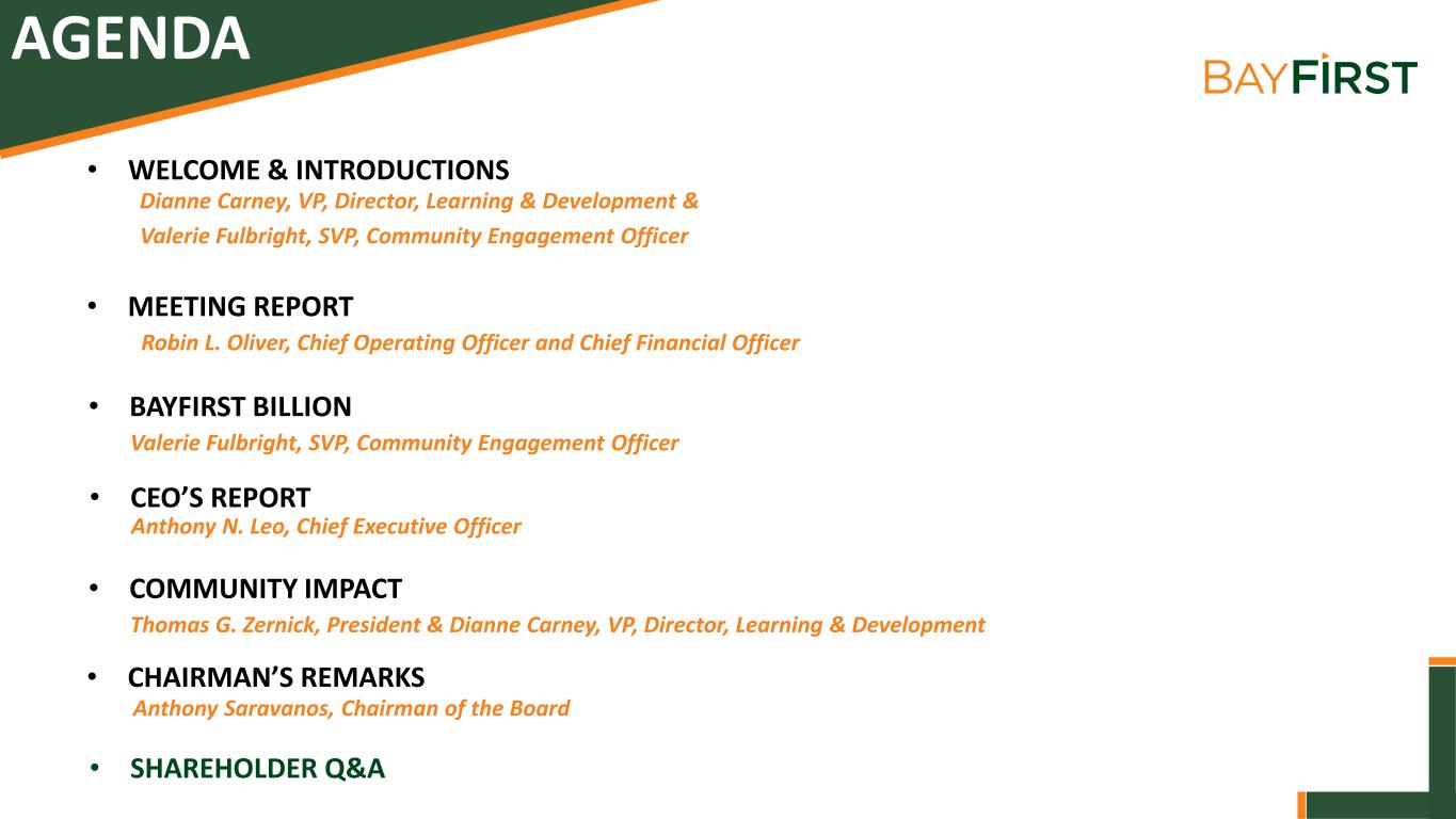AGENDA • WELCOME & INTRODUCTIONS • CEO’S REPORT • SHAREHOLDER Q&A Dianne Carney, VP, Director, Learning & Development & Valerie Fulbright, SVP, Community Engagement Officer • MEETING REPORT Robin L. Oliver, Chief Operating Officer and Chief Financial Officer Anthony N. Leo, Chief Executive Officer • CHAIRMAN’S REMARKS Anthony Saravanos, Chairman of the Board • BAYFIRST BILLION Valerie Fulbright, SVP, Community Engagement Officer • COMMUNITY IMPACT Thomas G. Zernick, President & Dianne Carney, VP, Director, Learning & Development