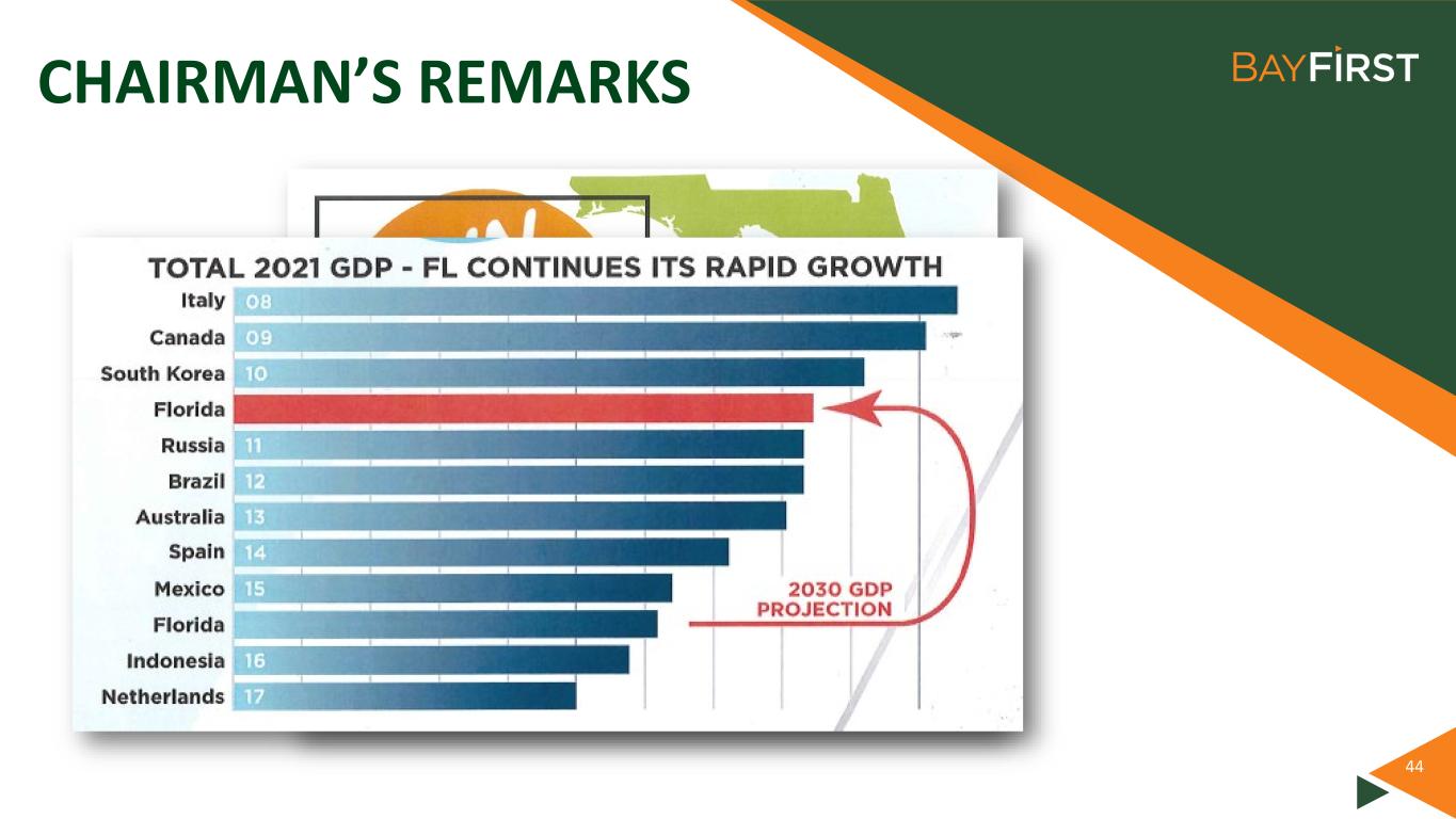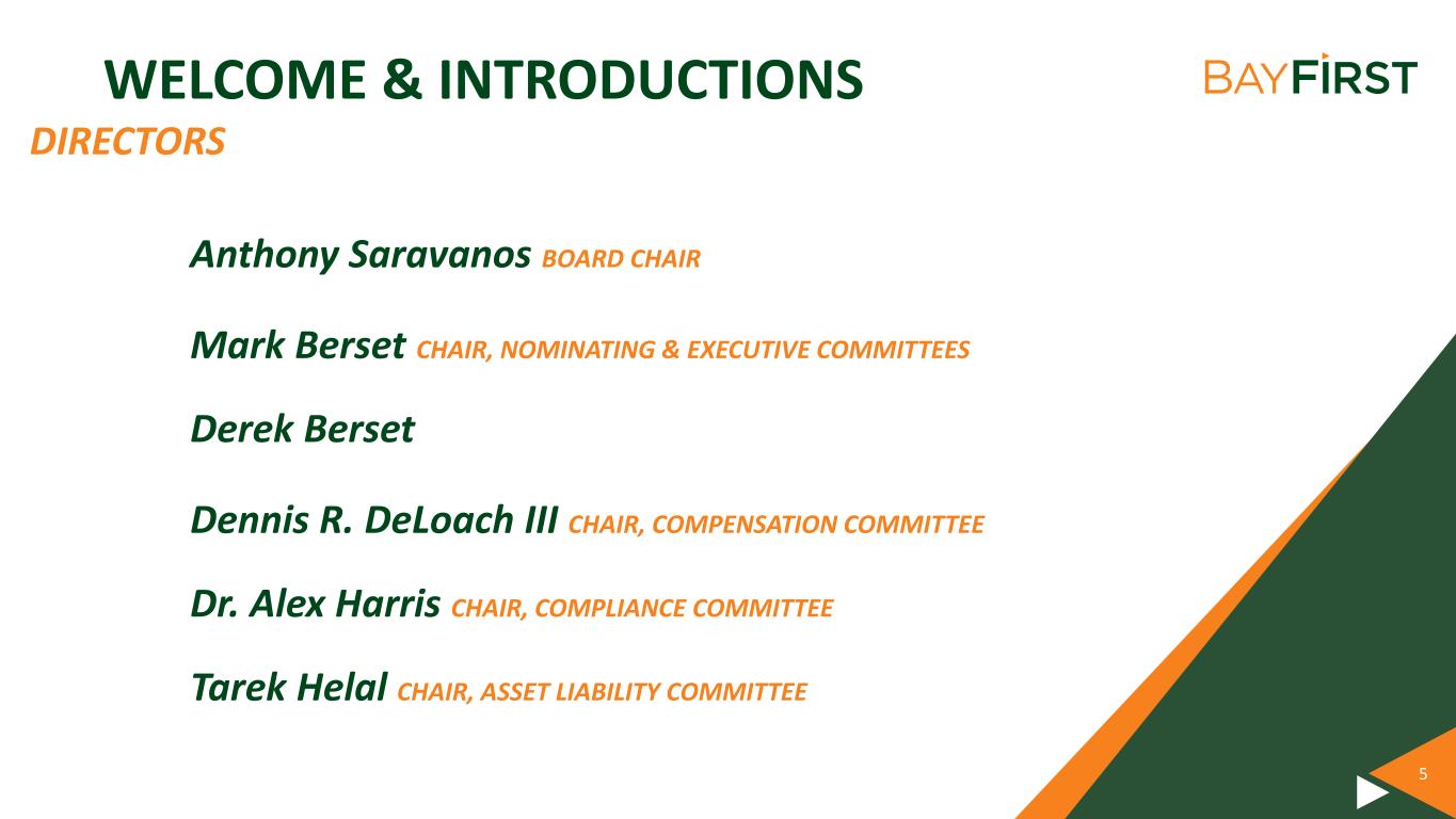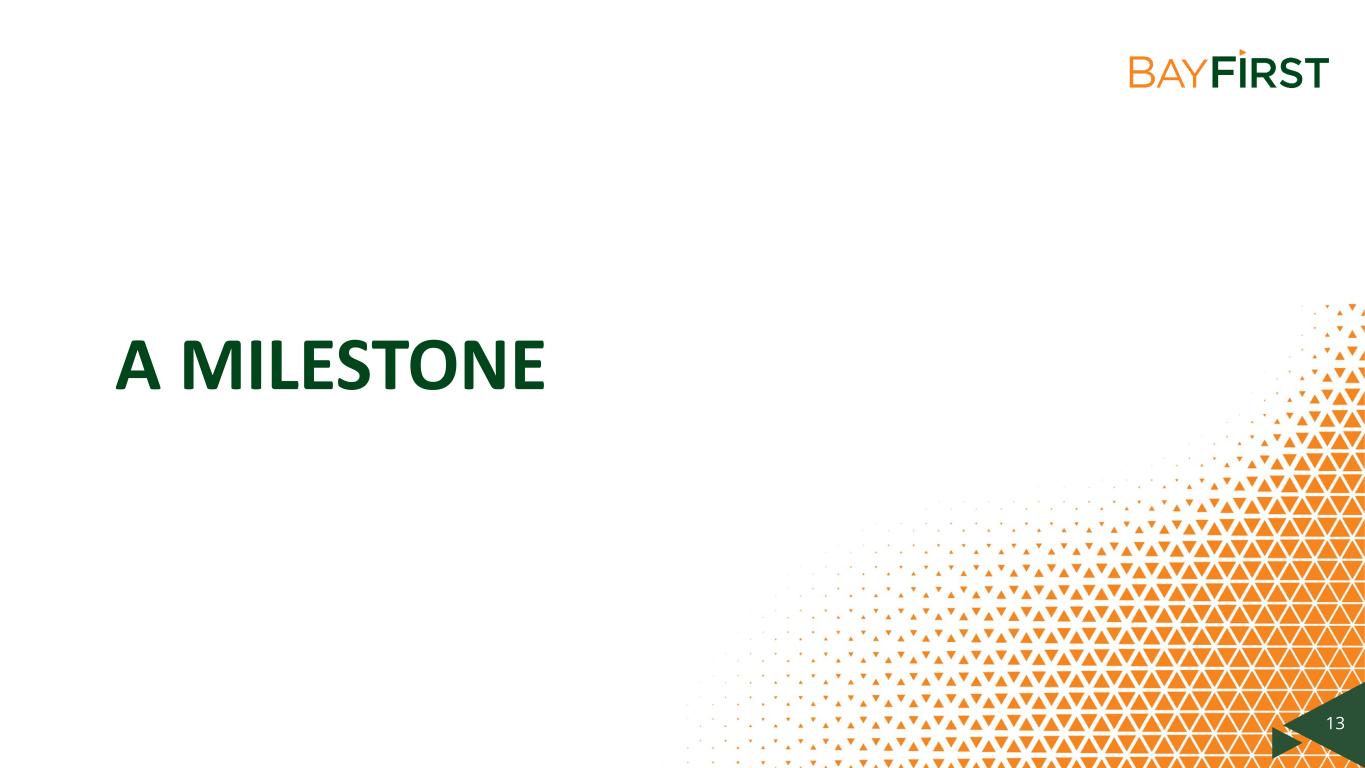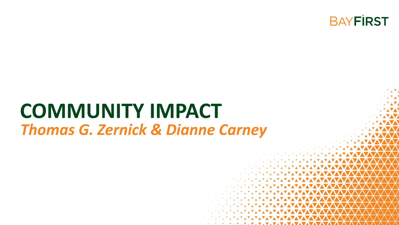 AGENDA • WELCOME & INTRODUCTIONS • CEO’S REPORT • SHAREHOLDER Q&A Dianne Carney, VP, Director, Learning & Development & Valerie Fulbright, SVP, Community Engagement Officer • MEETING REPORT Robin L. Oliver, Chief Operating Officer and Chief Financial Officer Anthony N. Leo, Chief Executive Officer • CHAIRMAN’S REMARKS Anthony Saravanos, Chairman of the Board • BAYFIRST BILLION Valerie Fulbright, SVP, Community Engagement Officer • COMMUNITY IMPACT Thomas G. Zernick, President & Dianne Carney, VP, Director, Learning & Development