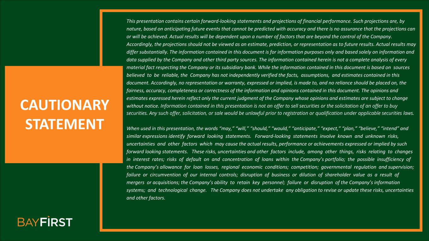 CAUTIONARY STATEMENT This presentation contains certain forward-looking statements and projections of financial performance. Such projections are, by nature, based on anticipating future events that cannot be predicted with accuracy and there is no assurance that the projections can or will be achieved. Actual results will be dependent upon a number of factors that are beyond the control of the Company. Accordingly, the projections should not be viewed as an estimate, prediction, or representation as to future results. Actual results may differ substantially. The information contained in this document is for information purposes only and based solely on information and data supplied by the Company and other third party sources. The information contained herein is not a complete analysis of every material fact respecting the Company or its subsidiary bank. While the information contained in this document is based on sources believed to be reliable, the Company has not independently verified the facts, assumptions, and estimates contained in this document. Accordingly, no representation or warranty, expressed or implied, is made to, and no reliance should be placed on, the fairness, accuracy, completeness or correctness of the information and opinions contained in this document. The opinions and estimates expressed herein reflect only the current judgment of the Company whose opinions and estimates are subject to change without notice. Information contained in this presentation is not an offer to sell securities or the solicitation of an offer to buy securities. Any such offer, solicitation, or sale would be unlawful prior to registration or qualification under applicable securities laws. When used in this presentation, the words “may,” “will,” “should,” “would,” “anticipate,” “expect,” “plan,” “believe,” “intend” and similar expressions identify forward looking statements. Forward-looking statements involve known and unknown risks, uncertainties and other factors which may cause the actual results, performance or achievements expressed or implied by such forward looking statements. These risks, uncertainties and other factors include, among other things, risks relating to changes in interest rates; risks of default on and concentration of loans within the Company’s portfolio; the possible insufficiency of the Company’s allowance for loan losses, regional economic conditions; competition; governmental regulation and supervision; failure or circumvention of our internal controls; disruption of business or dilution of shareholder value as a result of mergers or acquisitions; the Company’s ability to retain key personnel; failure or disruption of the Company’s information systems; and technological change. The Company does not undertake any obligation to revise or update these risks, uncertainties and other factors.