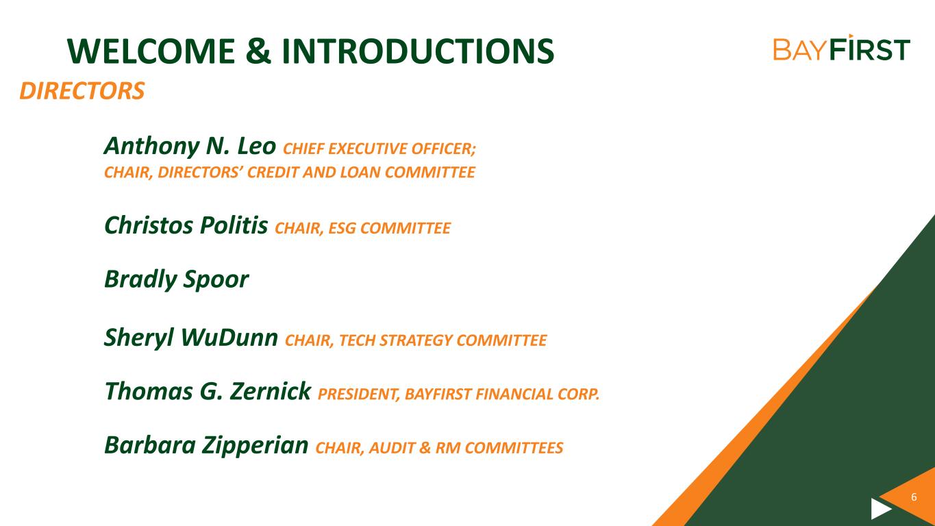 5 WELCOME & INTRODUCTIONS DIRECTORS Anthony Saravanos BOARD CHAIR Mark Berset CHAIR, NOMINATING & EXECUTIVE COMMITTEES Derek Berset Dennis R. DeLoach III CHAIR, COMPENSATION COMMITTEE Dr. Alex Harris CHAIR, COMPLIANCE COMMITTEE Tarek Helal CHAIR, ASSET LIABILITY COMMITTEE