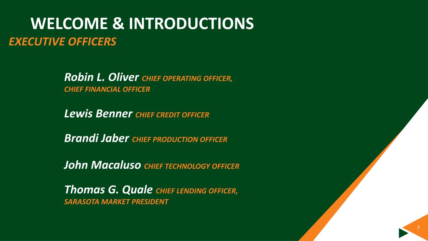 6 WELCOME & INTRODUCTIONS DIRECTORS Anthony N. Leo CHIEF EXECUTIVE OFFICER; CHAIR, DIRECTORS’ CREDIT AND LOAN COMMITTEE Christos Politis CHAIR, ESG COMMITTEE Bradly Spoor Sheryl WuDunn CHAIR, TECH STRATEGY COMMITTEE Thomas G. Zernick PRESIDENT, BAYFIRST FINANCIAL CORP. Barbara Zipperian CHAIR, AUDIT & RM COMMITTEES