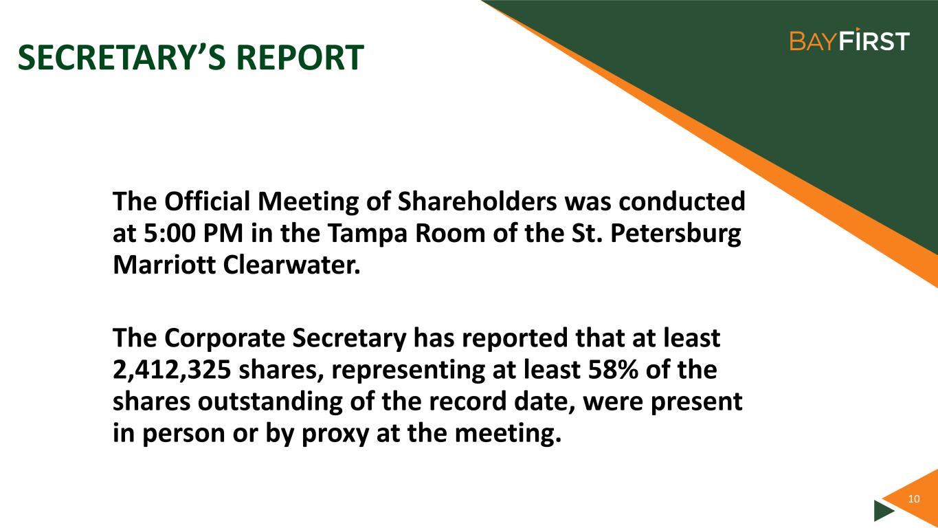 10 SECRETARY’S REPORT The Official Meeting of Shareholders was conducted at 5:00 PM in the Tampa Room of the St. Petersburg Marriott Clearwater. The Corporate Secretary has reported that at least 2,412,325 shares, representing at least 58% of the shares outstanding of the record date, were present in person or by proxy at the meeting.