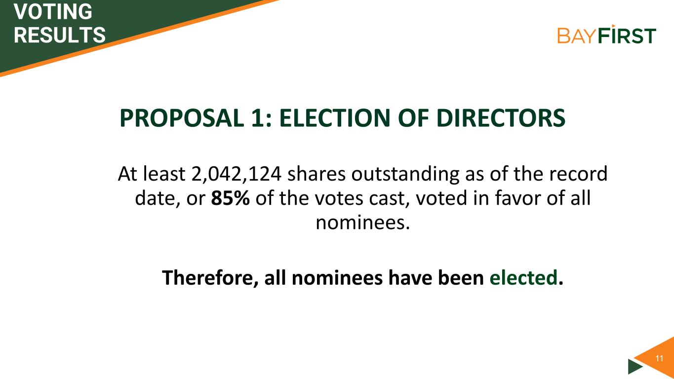 11 VOTING RESULTS PROPOSAL 1: ELECTION OF DIRECTORS At least 2,042,124 shares outstanding as of the record date, or 85% of the votes cast, voted in favor of all nominees. Therefore, all nominees have been elected.
