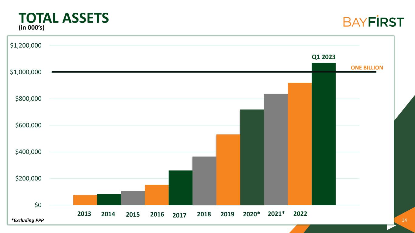 14 2013 2014 2015 2016 2017 2018 2019 2020* 2021* 2022 Q1 2023 $0 $200,000 $400,000 $600,000 $800,000 $1,000,000 $1,200,000 TOTAL ASSETS (in 000’s) ONE BILLION *Excluding PPP
