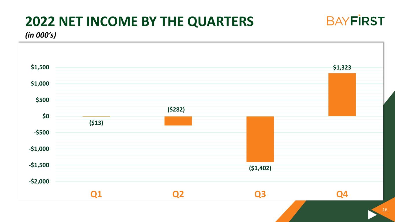 16 2022 NET INCOME BY THE QUARTERS (in 000’s) ($13) ($282) ($1,402) $1,323 -$2,000 -$1,500 -$1,000 -$500 $0 $500 $1,000 $1,500 Q1 Q2 Q3 Q4