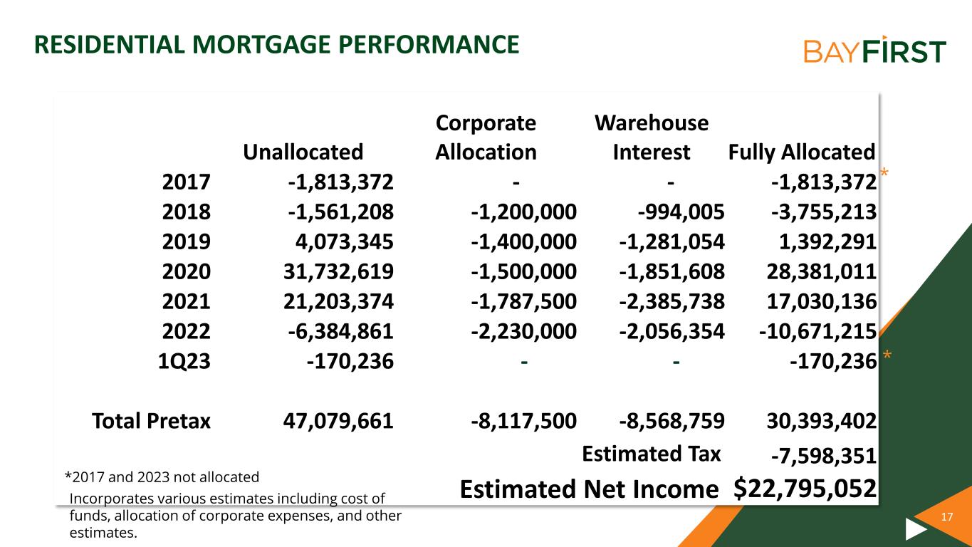 17 RESIDENTIAL MORTGAGE PERFORMANCE Unallocated Corporate Allocation Warehouse Interest Fully Allocated 2017 -1,813,372 - - -1,813,372 2018 -1,561,208 -1,200,000 -994,005 -3,755,213 2019 4,073,345 -1,400,000 -1,281,054 1,392,291 2020 31,732,619 -1,500,000 -1,851,608 28,381,011 2021 21,203,374 -1,787,500 -2,385,738 17,030,136 2022 -6,384,861 -2,230,000 -2,056,354 -10,671,215 1Q23 -170,236 - - -170,236 Total Pretax 47,079,661 -8,117,500 -8,568,759 30,393,402 -7,598,351 $22,795,052Estimated Net IncomeIncorporates various estimates including cost of funds, allocation of corporate expenses, and other estimates. *2017 and 2023 not allocated * * Estimated Tax