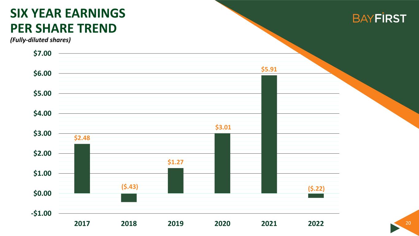 19 SIX YEAR EARNINGS TREND (in 000’s) $3,340 -$1,205 $4,484 $12,703 $24,618 -$349 -$5,000 $0 $5,000 $10,000 $15,000 $20,000 $25,000 $30,000 2017 2018 2019 2020 2021 2022