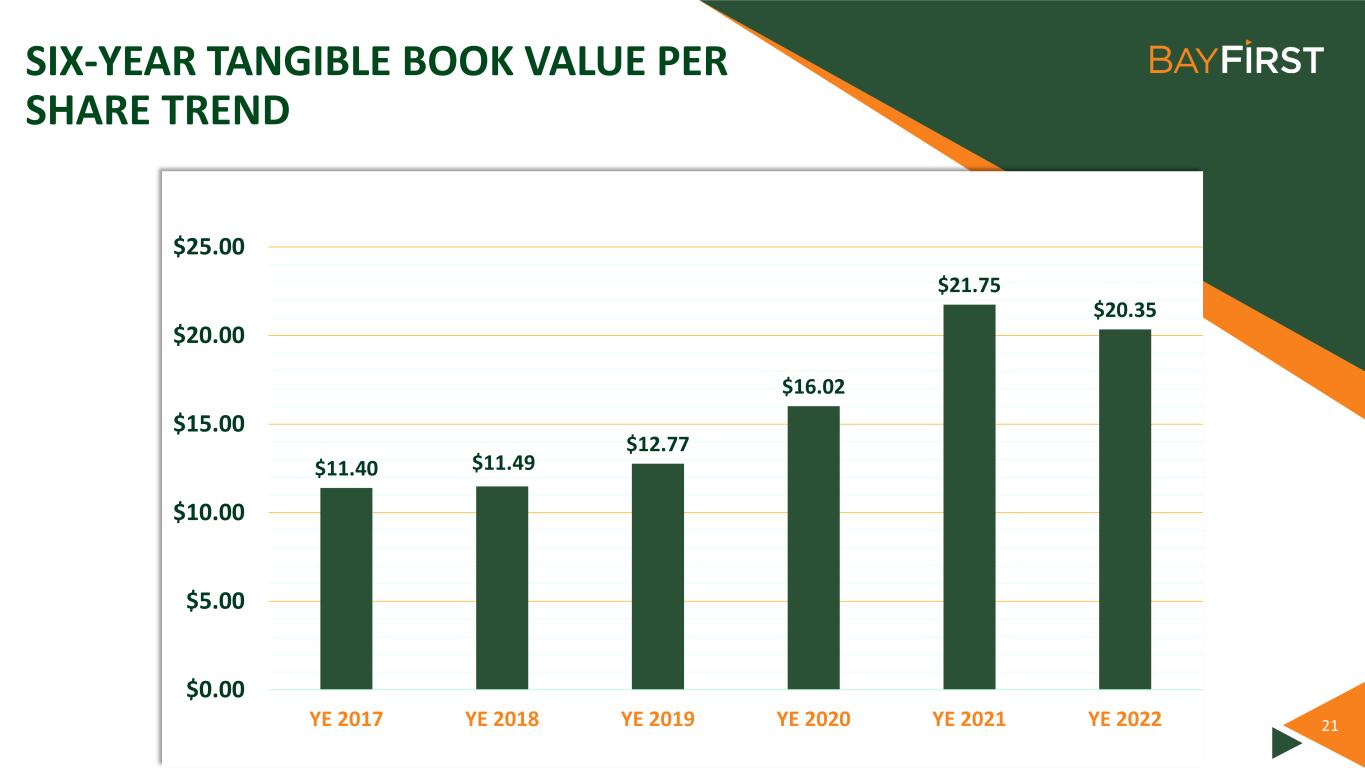 21 SIX-YEAR TANGIBLE BOOK VALUE PER SHARE TREND $11.40 $11.49 $12.77 $16.02 $21.75 $20.35 $0.00 $5.00 $10.00 $15.00 $20.00 $25.00 YE 2017 YE 2018 YE 2019 YE 2020 YE 2021 YE 2022