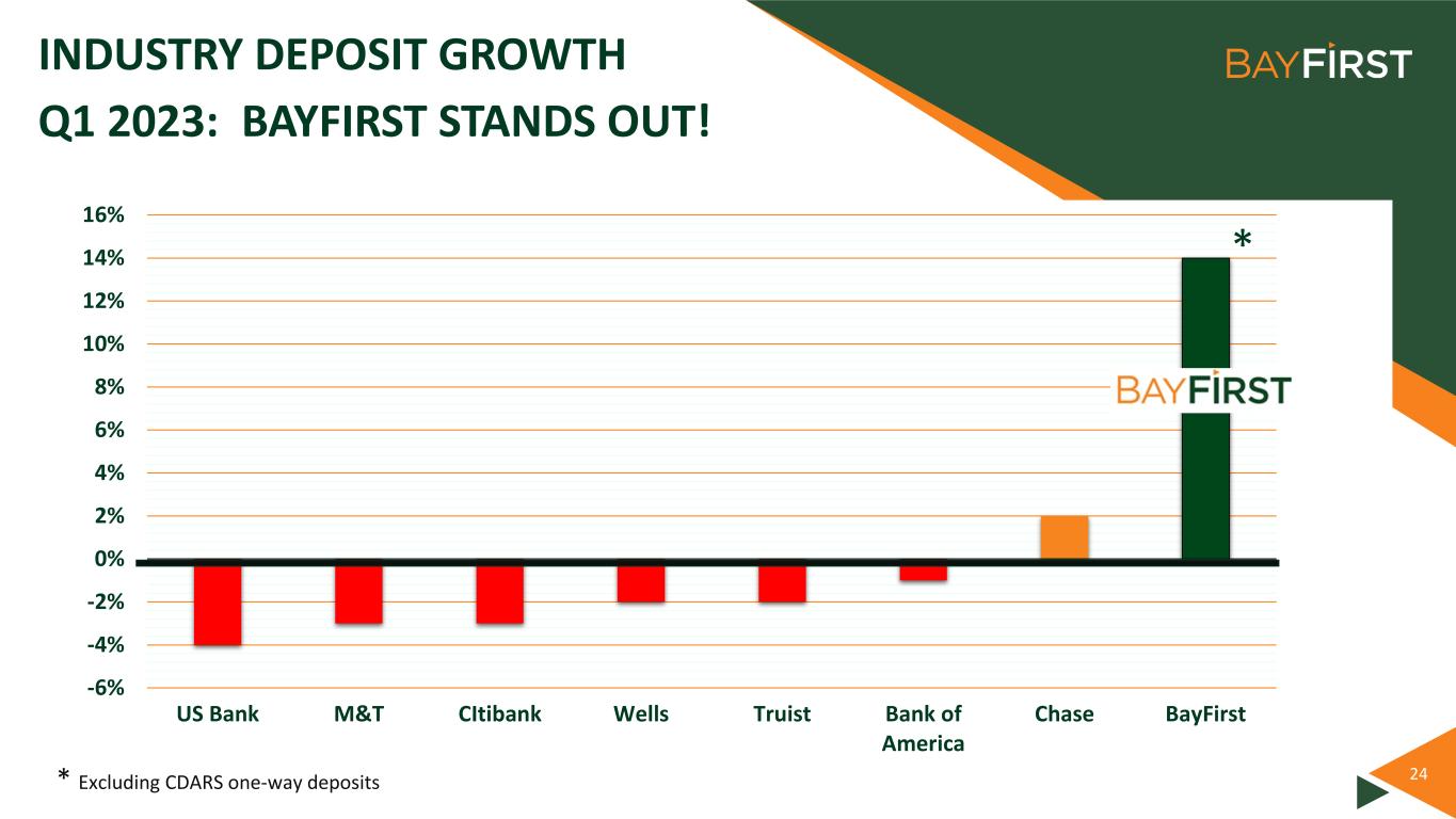 24 INDUSTRY DEPOSIT GROWTH Q1 2023: BAYFIRST STANDS OUT! -6% -4% -2% 0% 2% 4% 6% 8% 10% 12% 14% 16% US Bank M&T CItibank Wells Truist Bank of America Chase BayFirst * * Excluding CDARS one-way deposits