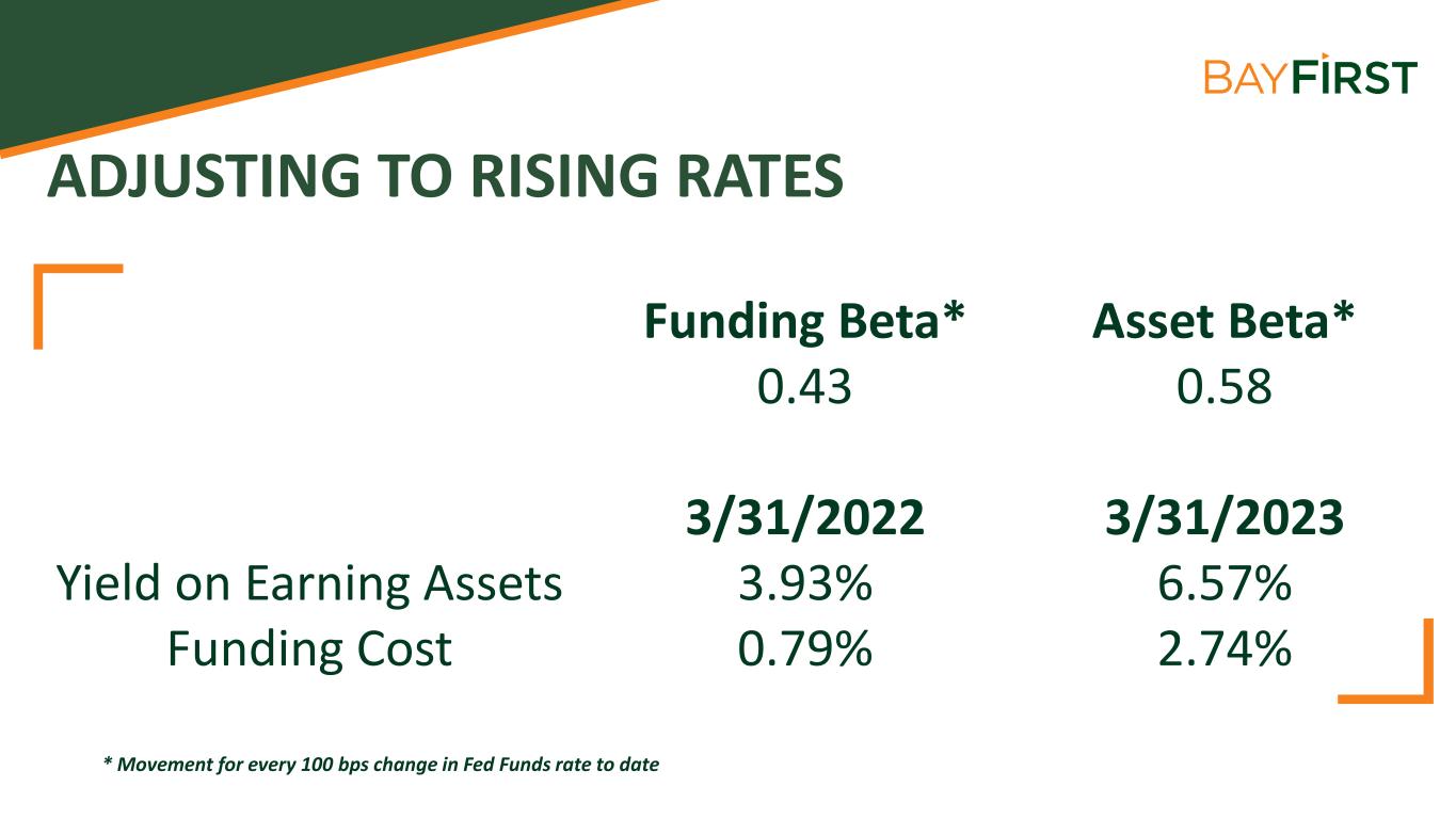 ADJUSTING TO RISING RATES Funding Beta* Asset Beta* 0.43 0.58 3/31/2022 3/31/2023 Yield on Earning Assets 3.93% 6.57% Funding Cost 0.79% 2.74% * Movement for every 100 bps change in Fed Funds rate to date
