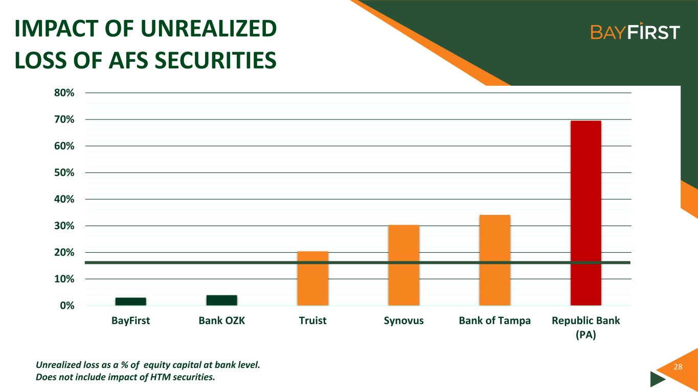 IMPACT OF UNREALIZED LOSS OF AFS SECURITIES 28 0% 10% 20% 30% 40% 50% 60% 70% 80% BayFirst Bank OZK Truist Synovus Bank of Tampa Republic Bank (PA) Unrealized loss as a % of equity capital at bank level. Does not include impact of HTM securities.