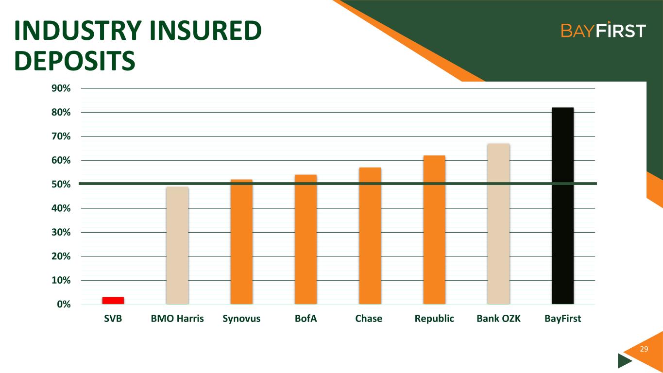 INDUSTRY INSURED DEPOSITS 29 0% 10% 20% 30% 40% 50% 60% 70% 80% 90% SVB BMO Harris Synovus BofA Chase Republic Bank OZK BayFirst